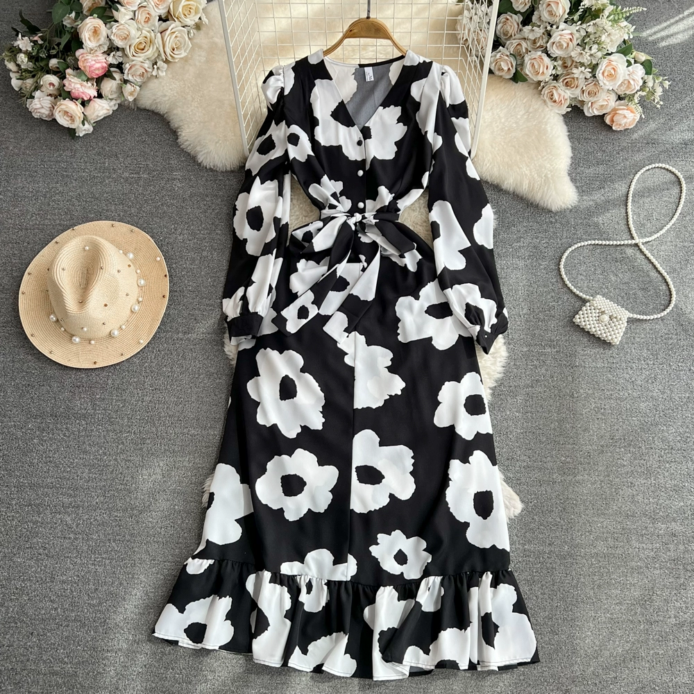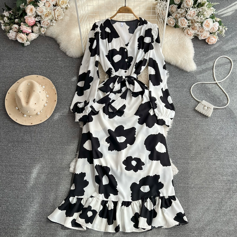 Female celebrity temperament puff sleeves V-neck waist slimming mid-length A-line printed ruffled fishtail dress
