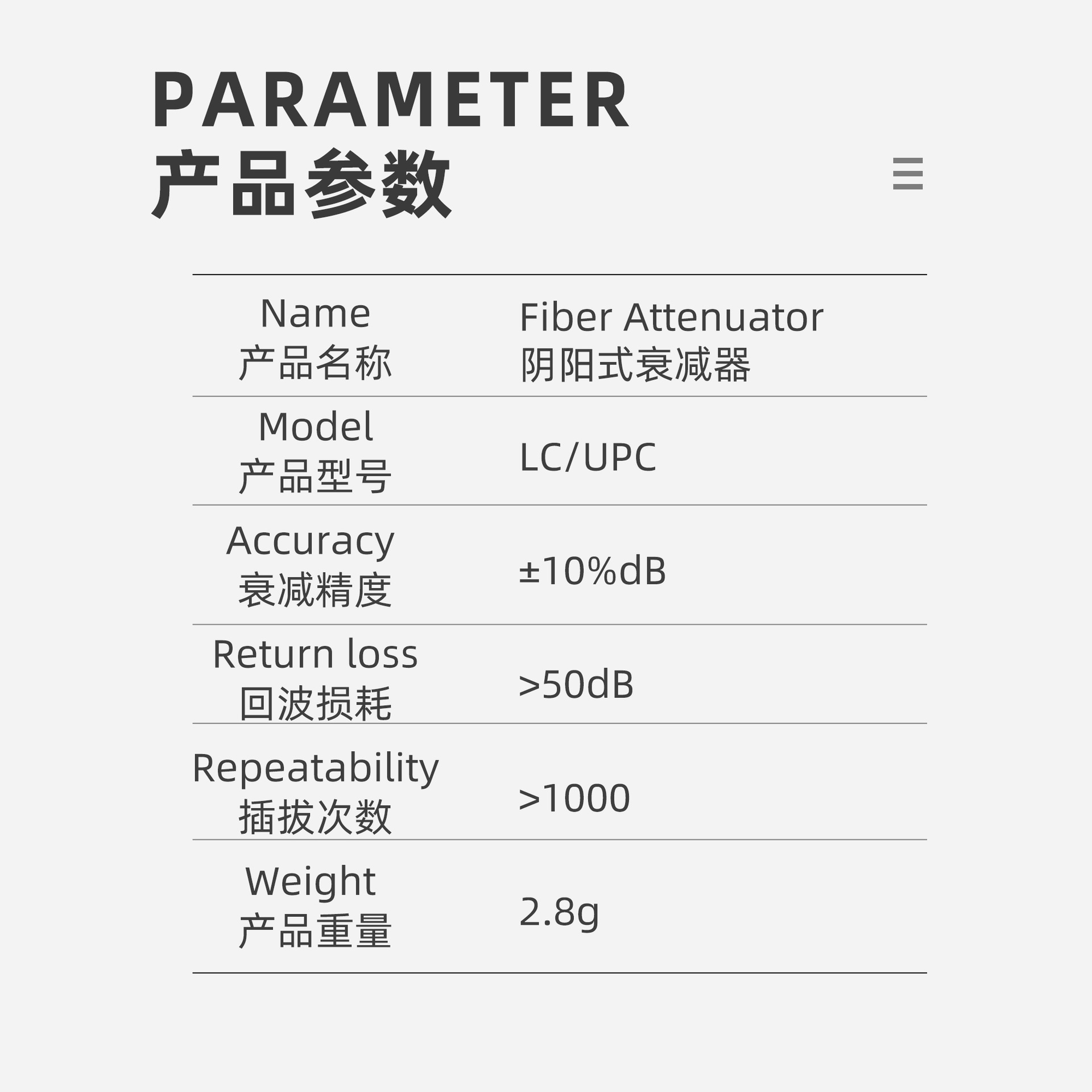 | nameOriginal | Fiber optic attenuator Single Mode LC/UPC high quality fixed Yin and Yang attenuator light attenuation adapter 1-30db optional |