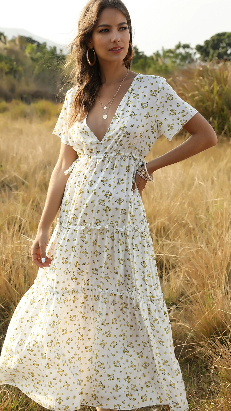 Findit 4-color ruffle floral bohemian slit long skirt deep V European and American fashion women’s dress