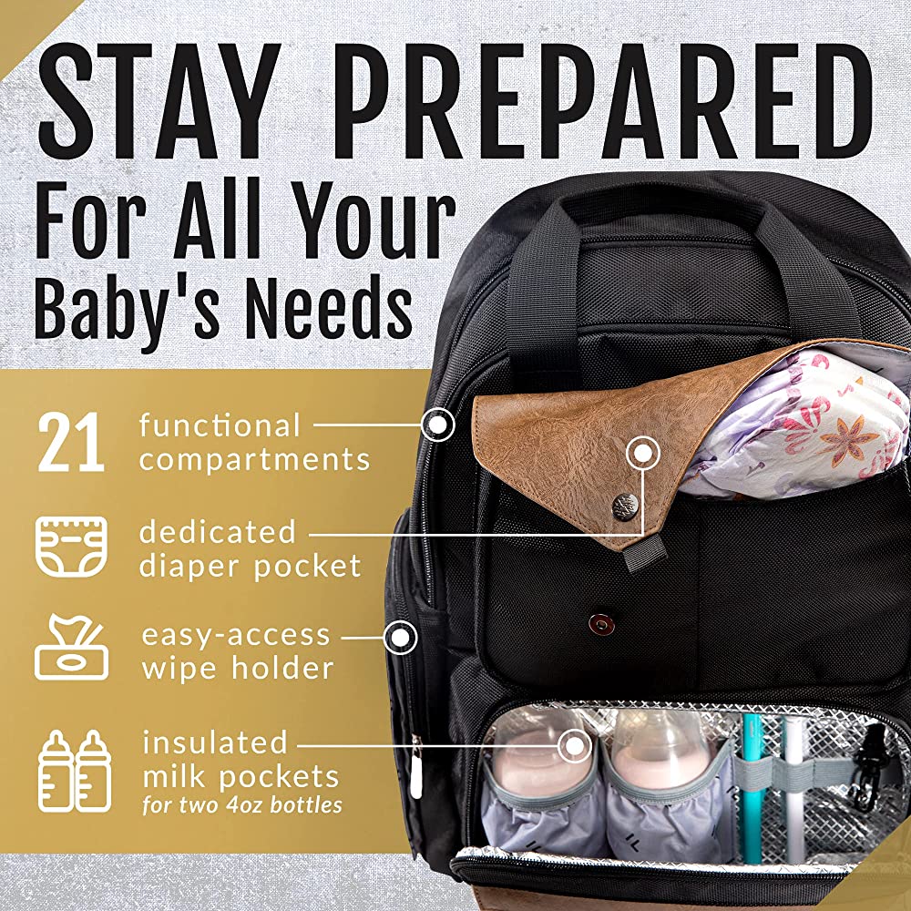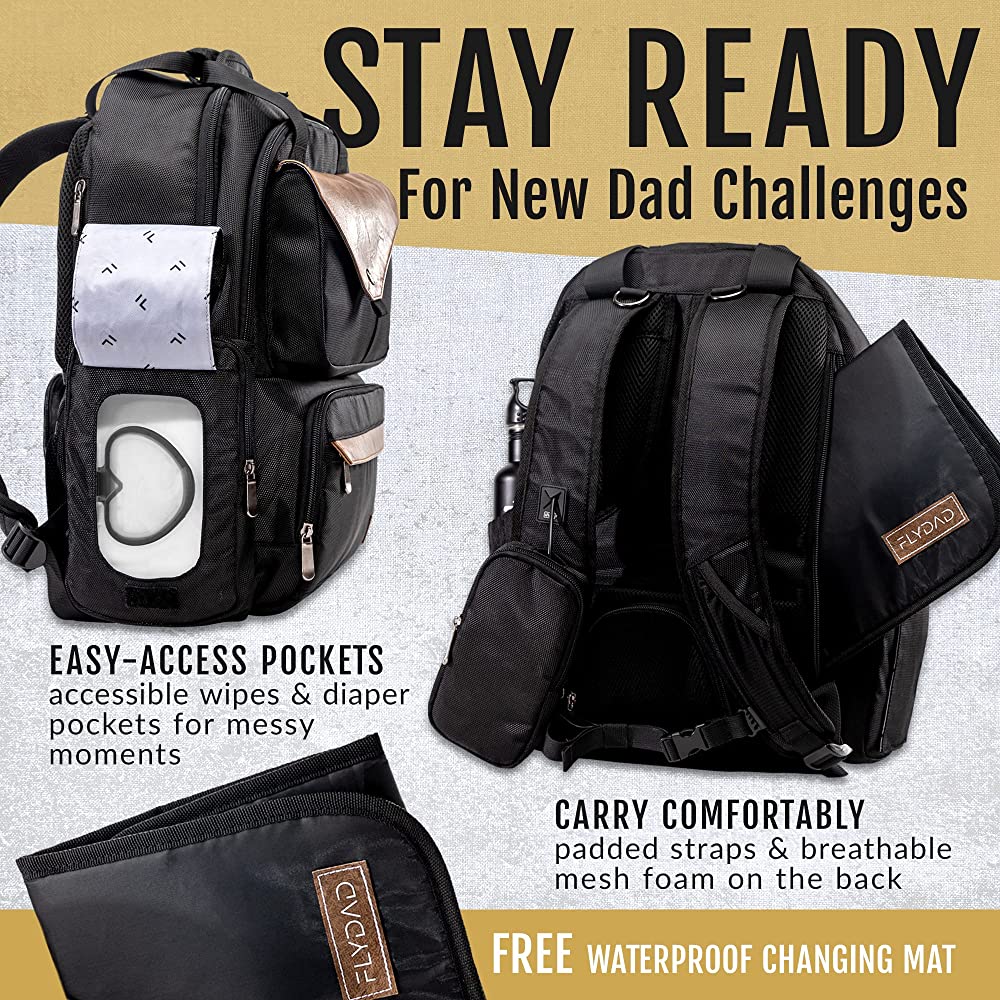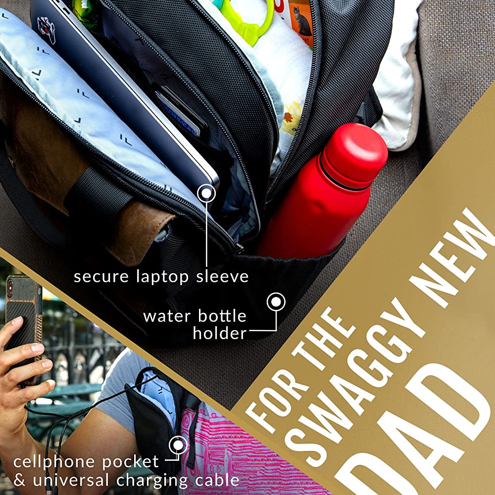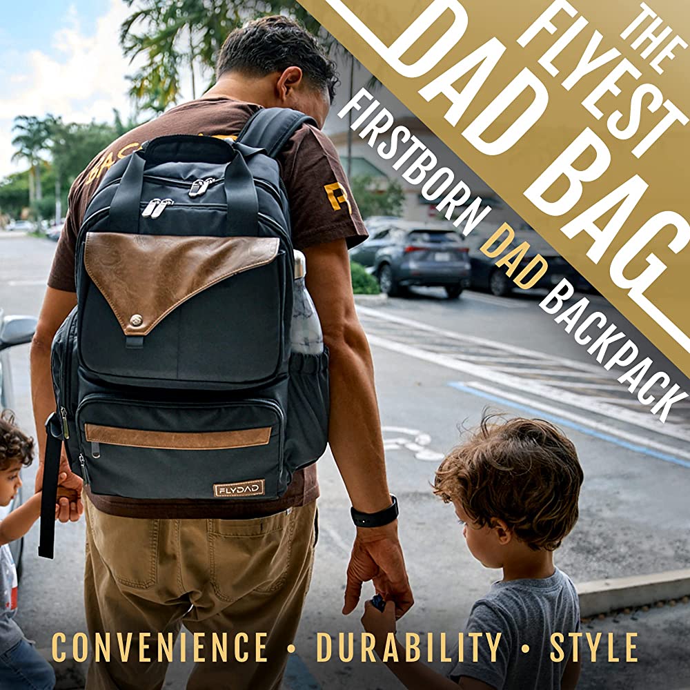 | nameOriginal | FlyDad – FirstBorn Men's Diaper Backpack, Stylish Diaper Backpack, Dad Diaper Bag, Mens Diaper Bag w/ 21 Compartments, Changing Mat, & Insulated Milk Pockets for Bottles (4oz), Brown Leather Accents |