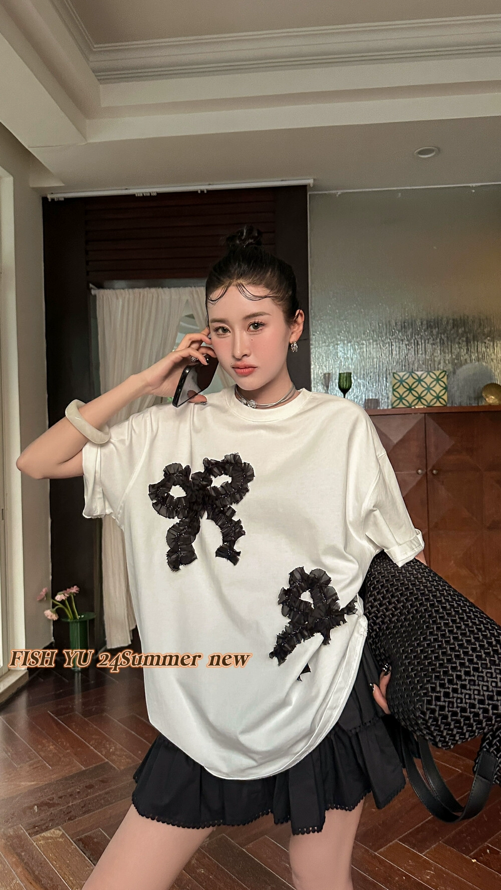FISH YU summer new Korean style INS style three-dimensional wood ear bow loose short-sleeved T-shirt women's casual
