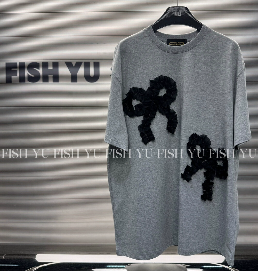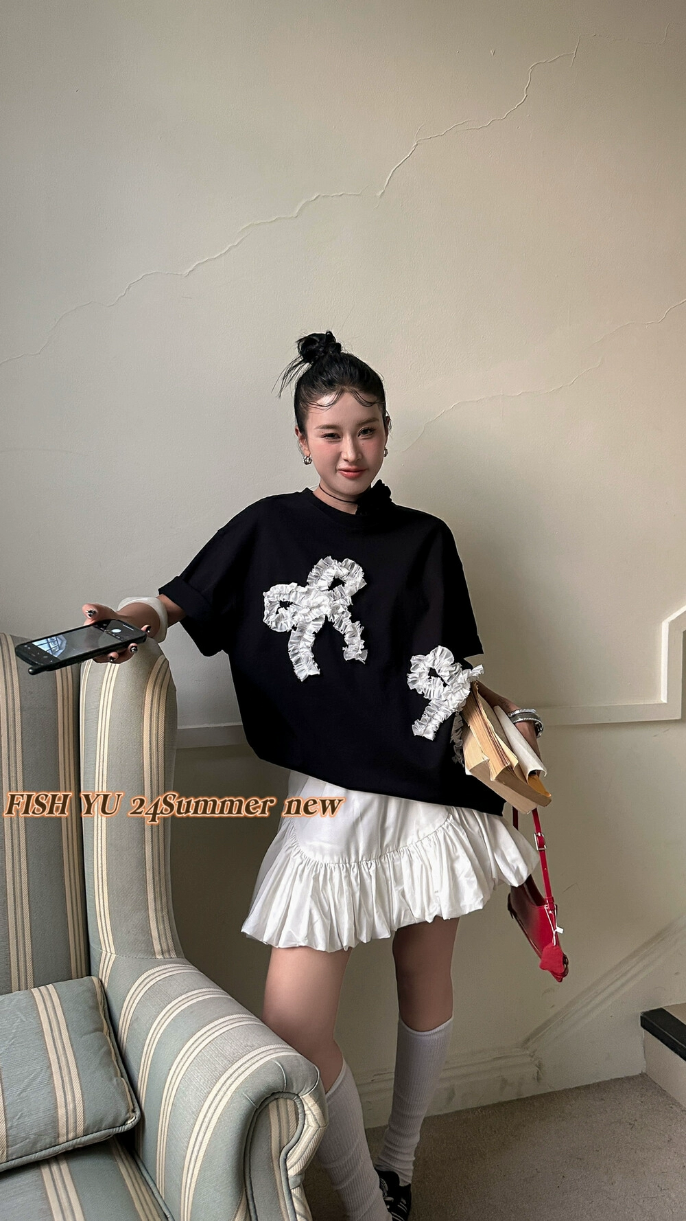 FISH YU summer new Korean style INS style three-dimensional wood ear bow loose short-sleeved T-shirt women’s casual