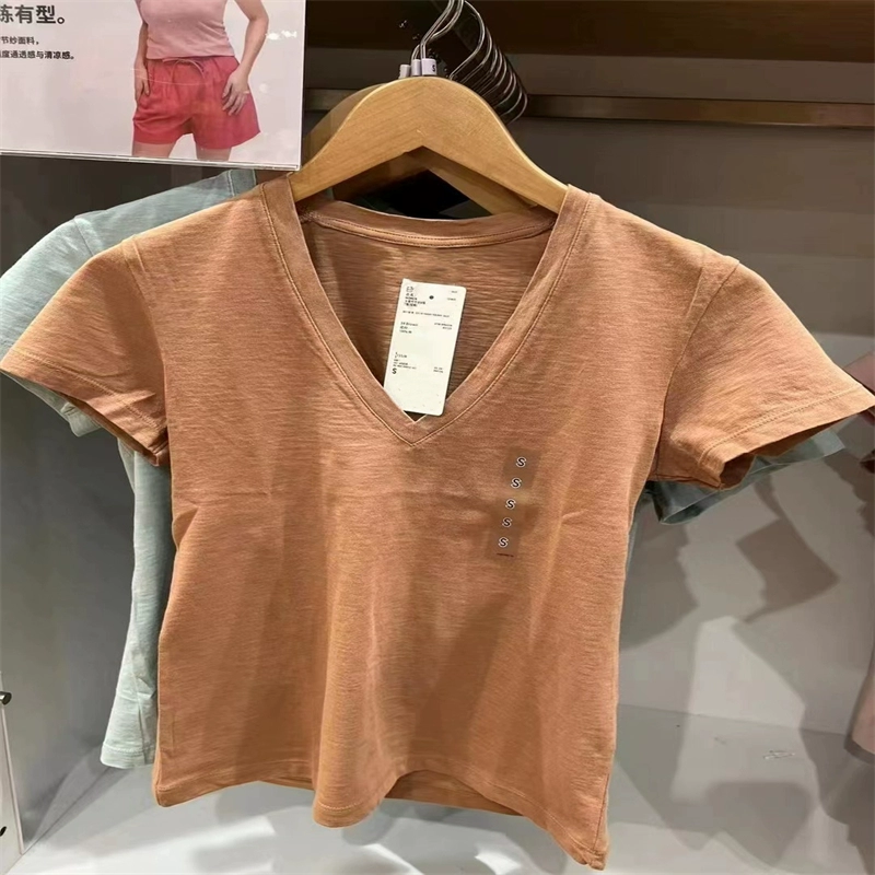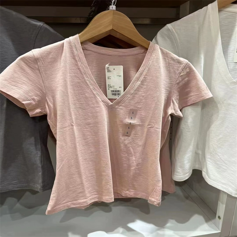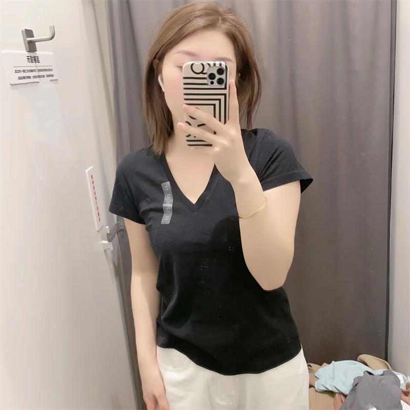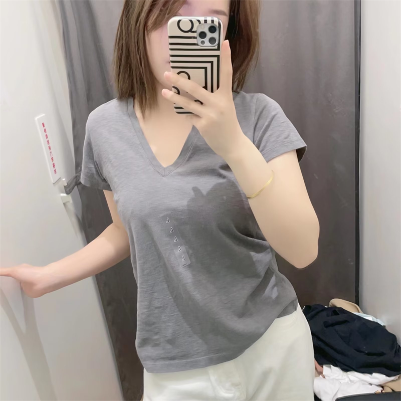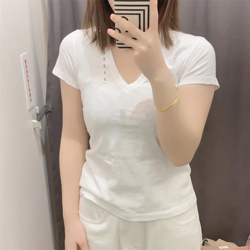Fitting room 2023 summer women’s clothing casual versatile simple bamboo joint yarn V-neck T-shirt solid color short-sleeved slim fit 456005