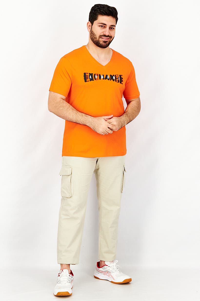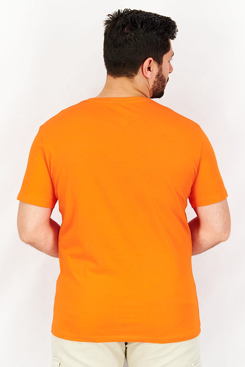 Care : Machine washable, Fit : Regular fit, Ideal For : Men, Size shown : US, Sleeve Length : Short Sleeve, T-Shirt Style : V- Neck, Types of Hem : Straight hem, Types of Neckline & Collar : V-neckline, Types of Sleeve : Short sleeve, Disclaimer : Product color may slightly vary due to photographic lighting sources or your monitor settings., Fabrics : 100% Cotton, Occasion : Casual, Pattern & Print : Graphic print, Types of Closures : Pullover, Color Family : Orange,