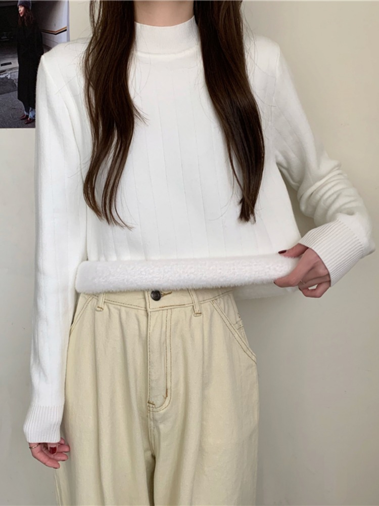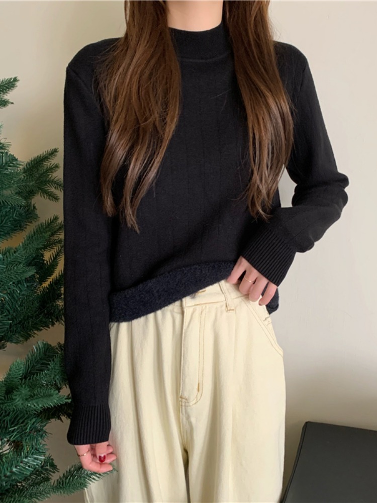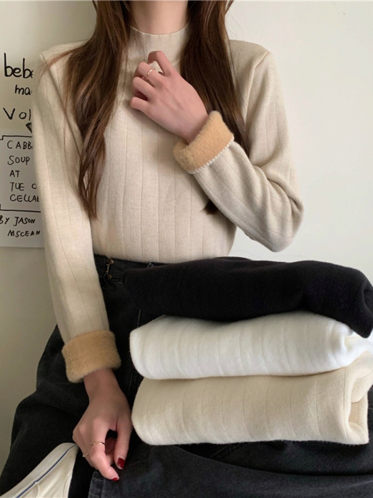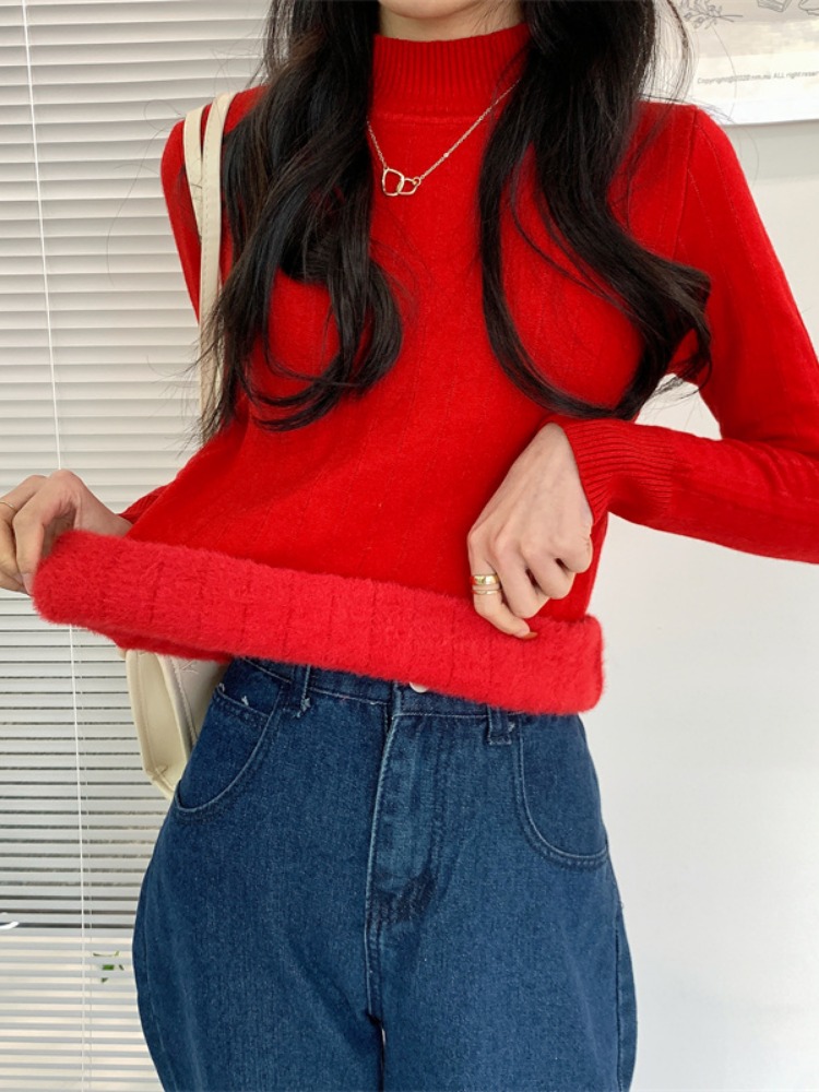 Fleece-lined thickened bottoming sweater for women Spring and Autumn slim-fit long sleeve half turtleneck one-piece velvet warm sweater top