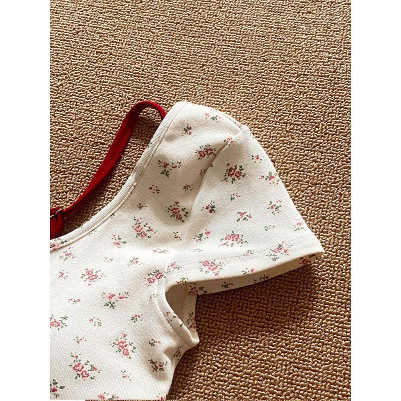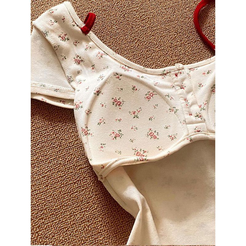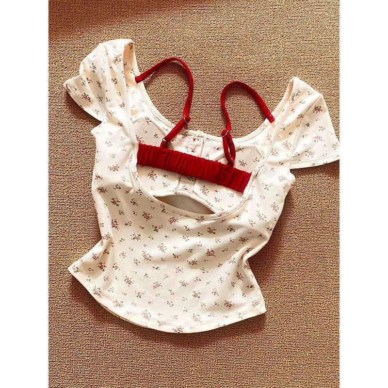 Floral backless!!! [With Chest Pad] Fake Two-piece Short-sleeved Shirt Women’s 2024 New Summer Printed Top