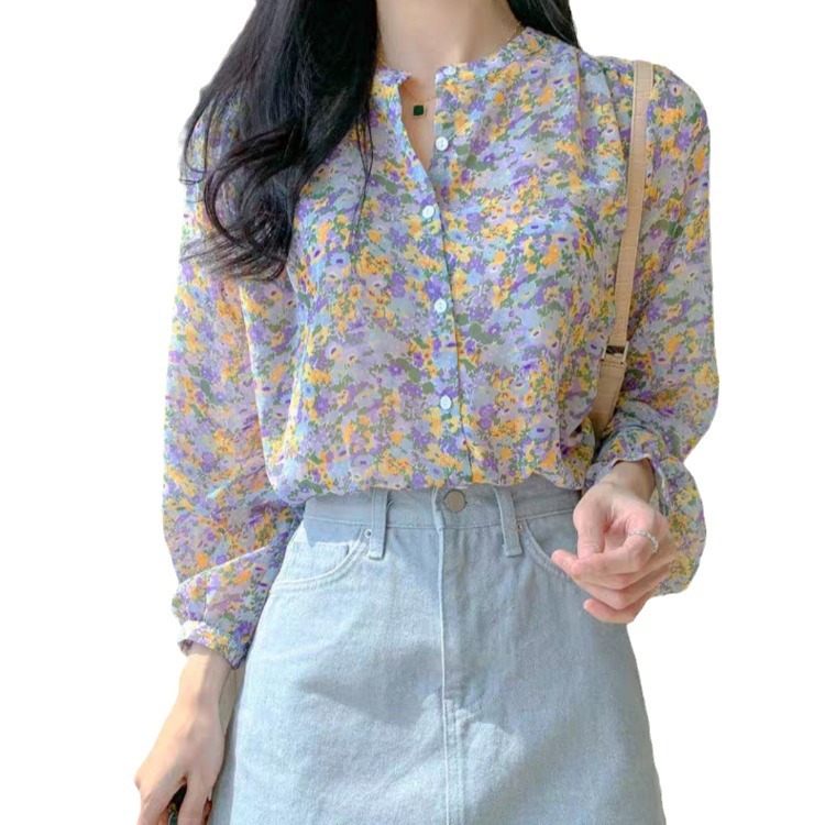 Floral Chiffon Shirt Women’s Spring and Summer New Design Sense Long Sleeve Round Neck Printed Stylish Top Sweet Small Shirt