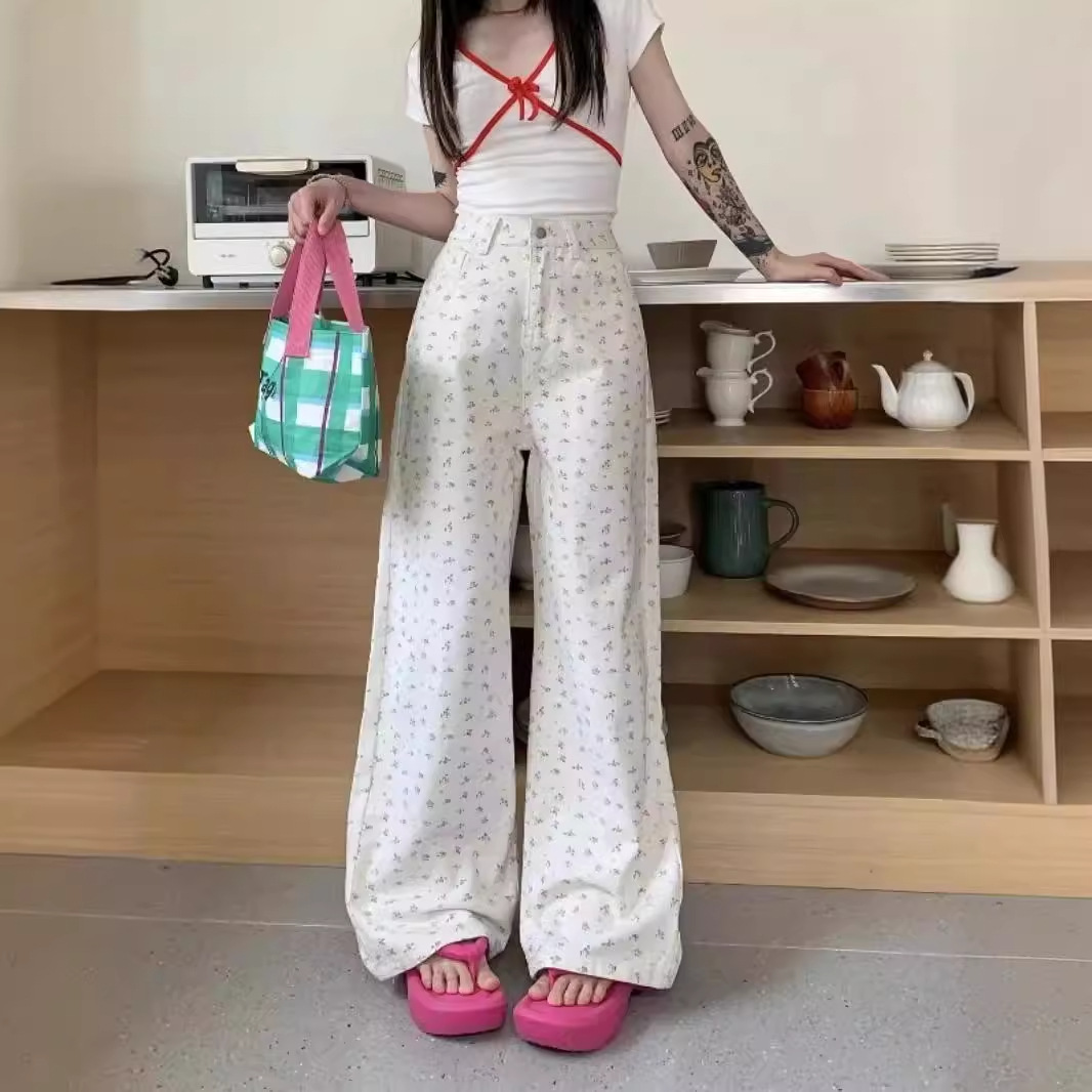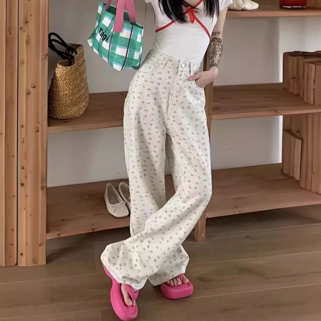 Floral Design Sense Casual Jeans Women’s Summer New American Style High Waist Slimming Straight Loose Wide Leg Long Pants