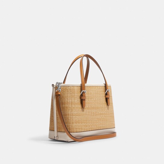 This product features a combination of straw and smooth leather materials, with a convenient zip-top closure and fabric lining. It also includes side open compartments, as well as handles with a 4 3/4″ drop and a detachable strap with a 22″ drop for versatile shoulder or crossbody wear. The dimensions of this item are 9 3/4″ (L) x 7 1/2″ (H) x 4 3/4″ (W), and its style number is CJ574.