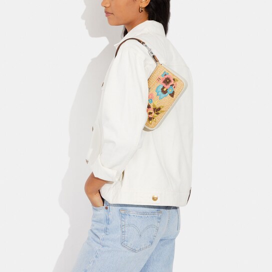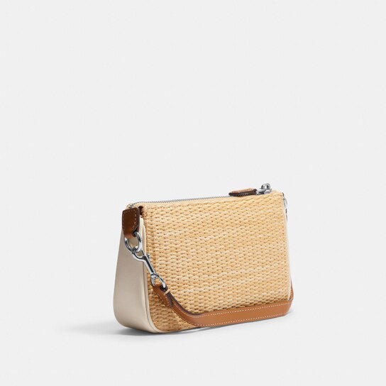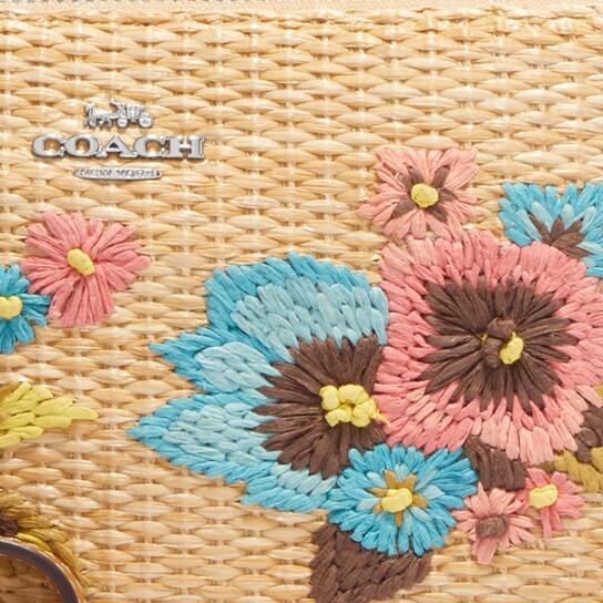This product features a combination of straw and smooth leather, with two slots for credit cards and a multifunctional pocket on the inside. It has a zip-top closure and is lined with fabric. The handle has a drop of 6 1/4 inches, and the dimensions of the product are 7 1/2 inches in length, 4 1/2 inches in height, and 2 inches in width. The style number for this product is CJ724.