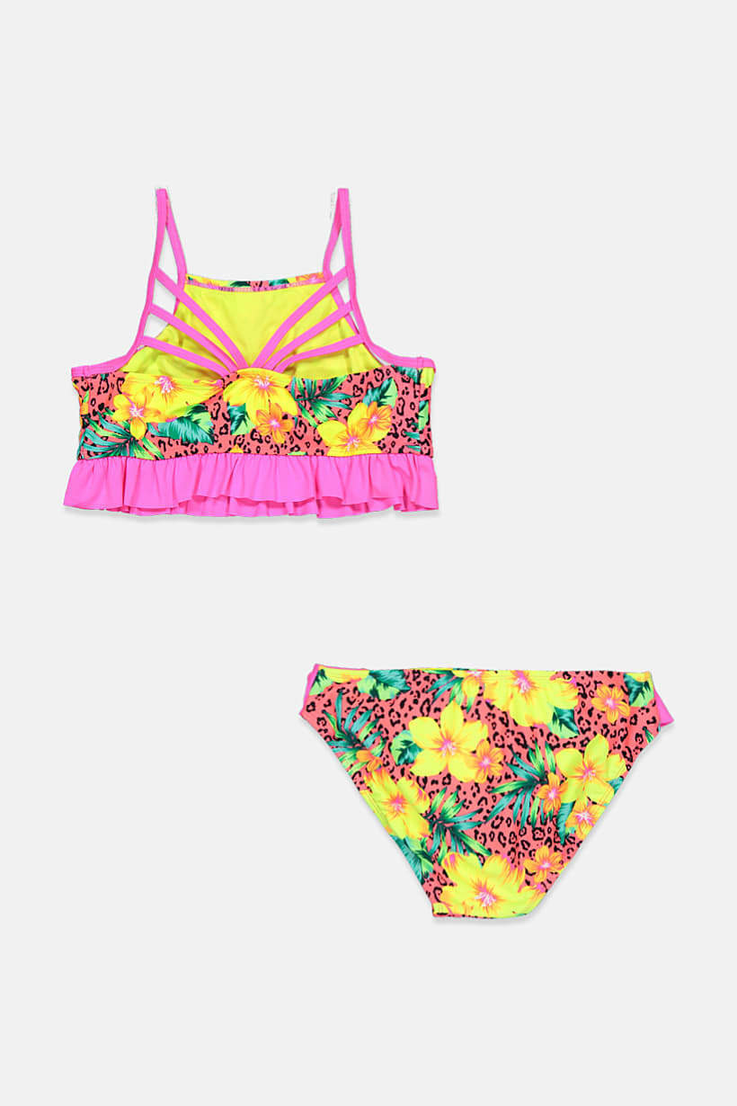 Floral Print Bikini Set for Girls, 2-Piece in Yellow and Neon Coral.