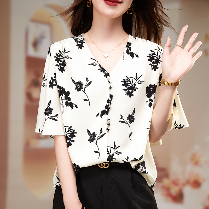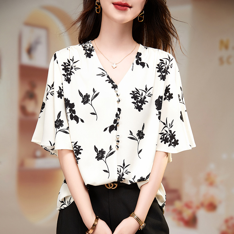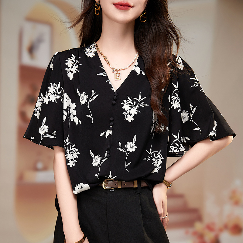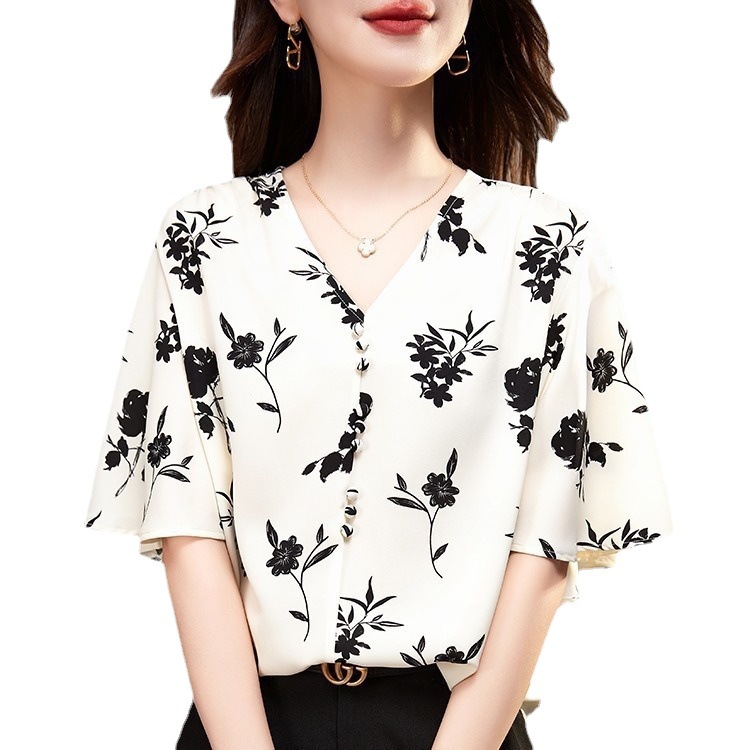 | nameOriginal | Floral-print V-neck Shirt Women's Summer 2024 New Arrival Loose Age-reducing Chic Chiffon Short-sleeved Top for Mothers Small Size |