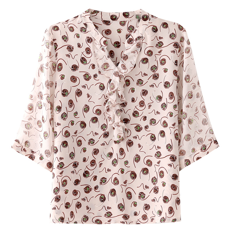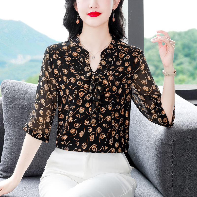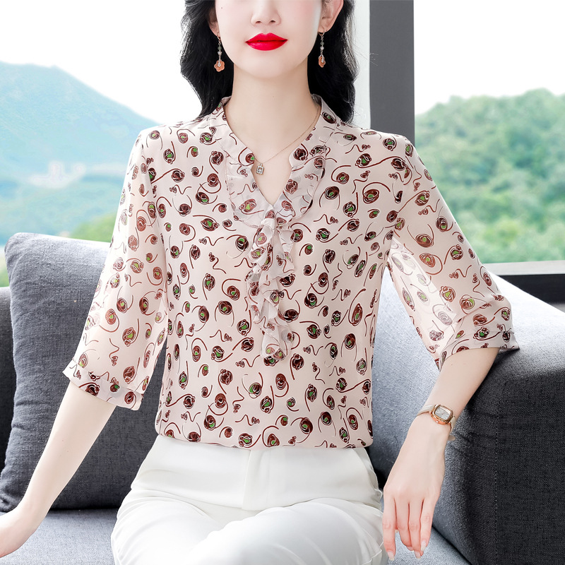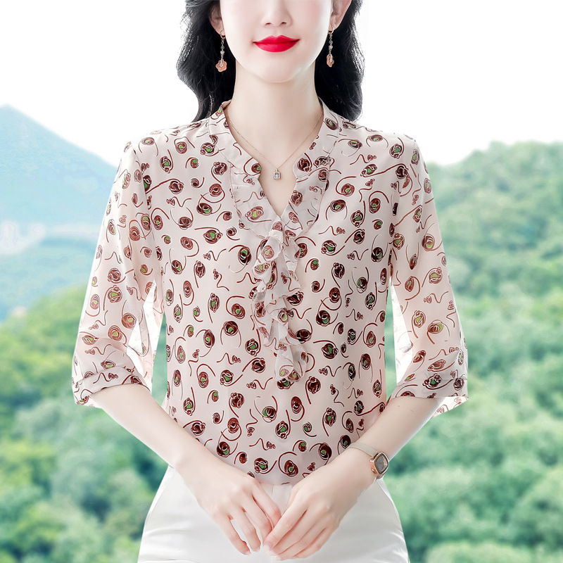 Floral Short-sleeved Shirt Women's Summer 2024 New Fashion Western Style Mother's Chiffon Shirt Seven-sleeved Shirt Top