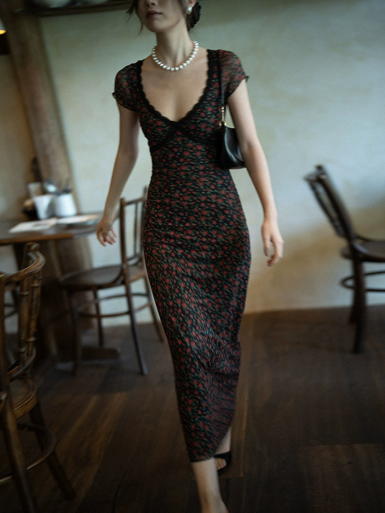 | nameOriginal | Floral v-neck slim fit waist-hugging dress |