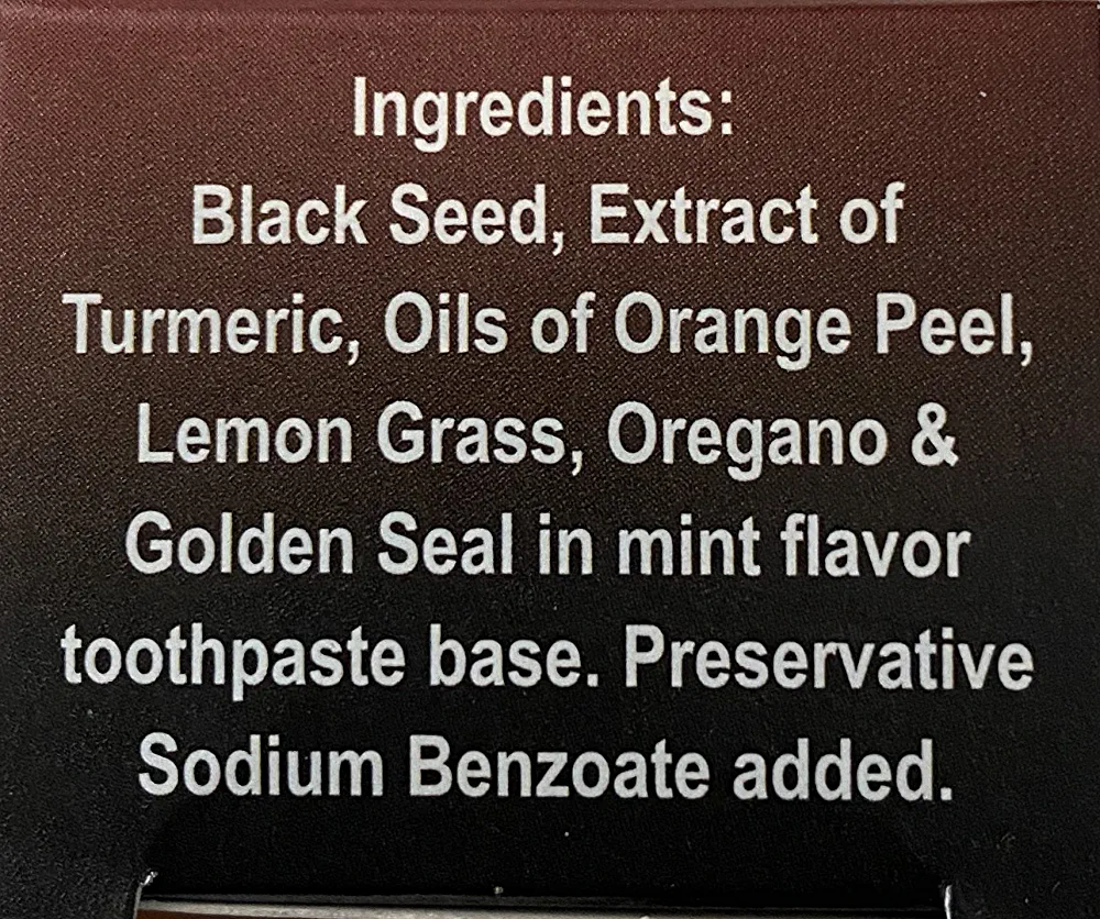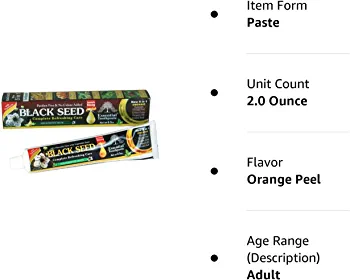 | descriptionOriginal | Description Get clean and healthy teeth with this Black Seed Toothpaste. It works well as an ingredient in toothpaste as it cleans the bad breath out of your mouth and protects your teeth and gums.The addition of orange peel and lemon grass cleans your teeth and gums and gives the toothpaste a fresh flavor.. Step up your oral health game with Black Seed Toothpaste. |
