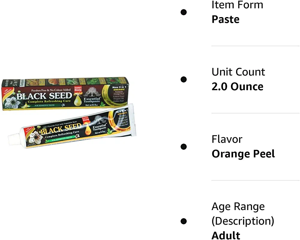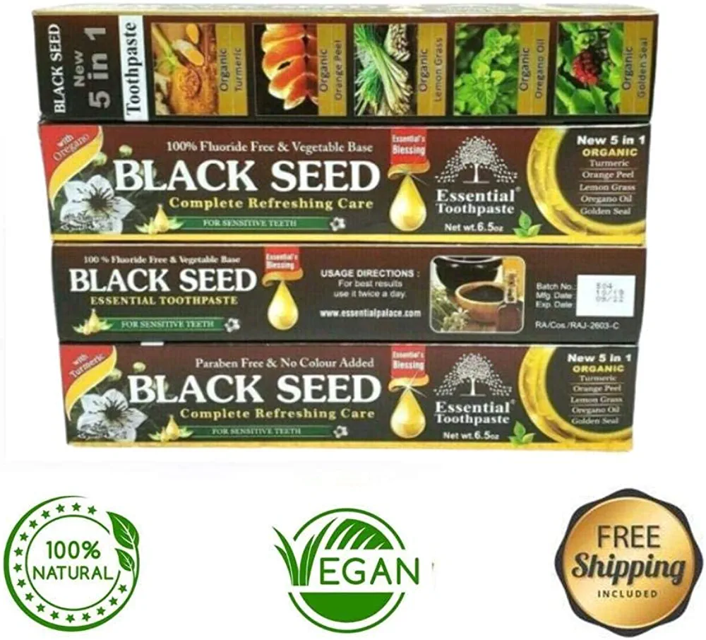 | nameOriginal | Organic Black Seed Essential Toothpaste 5 in 1 100% Fluoride Free & Vegetable Base for Seneitive Teeth. |