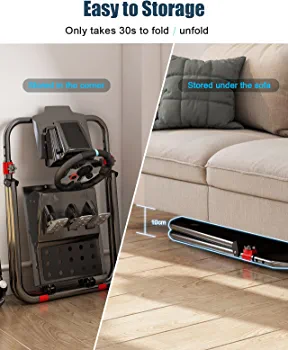 The stand is compatible with popular racing wheels such as Logitech G29/G923/G920 and Thrustmaster T300/T150/T248/T80, as well as PS5, PS4, and XBOX consoles. The sturdy construction of the stand ensures stability and durability, while the foldable design makes it easy to store when not in use.