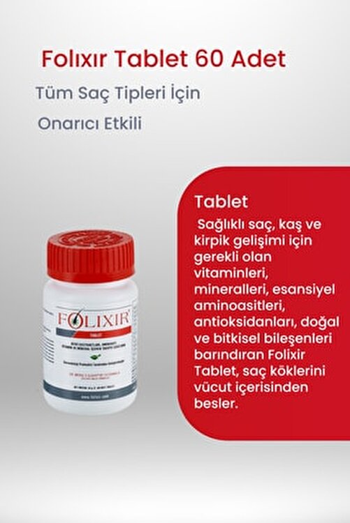 Folixir Tablet (60 Pcs Tablets) Folixir Tablet, which contains vitamins, minerals, essential amino acids, antioxidants, natural and herbal ingredients essential for healthy hair, eyebrow and eyelash development, nourishes the hair follicles from the body.