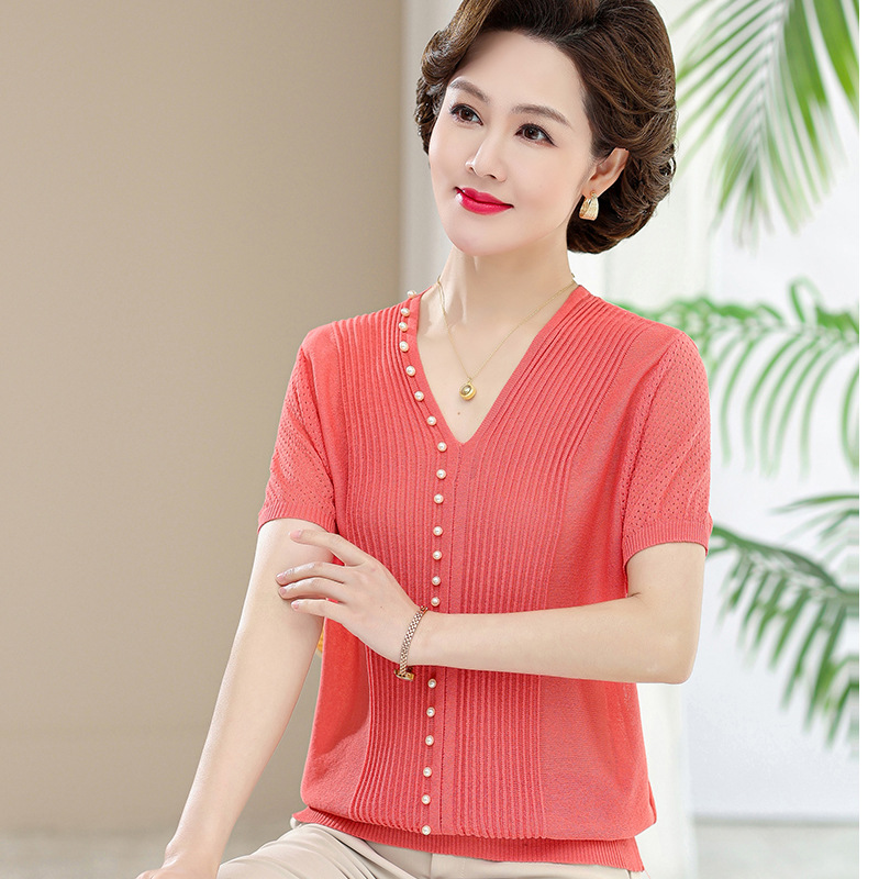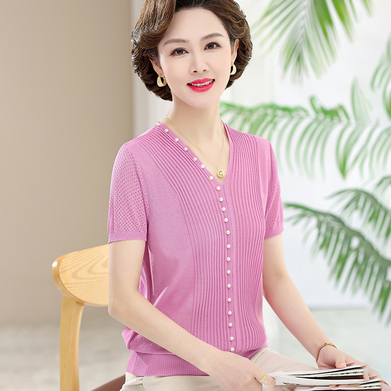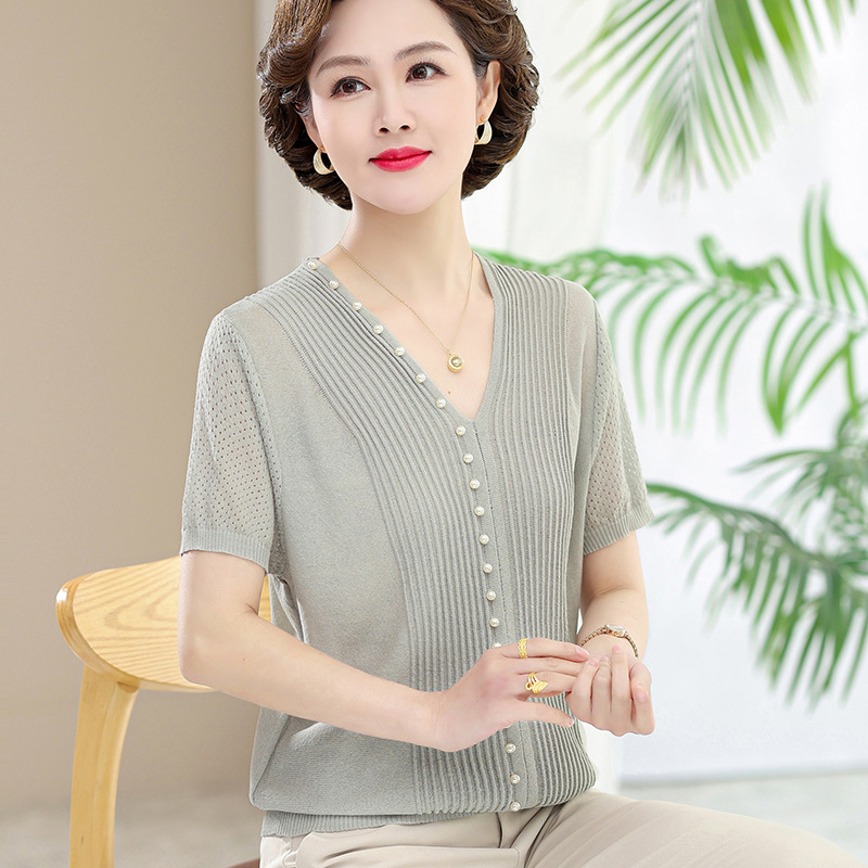 | nameOriginal | Foreign Style Mother's Summer New Short-sleeved Base V-neck Ice Silk T-shirt Middle-aged and Elderly Women's Knitted Short Loose Top |