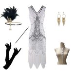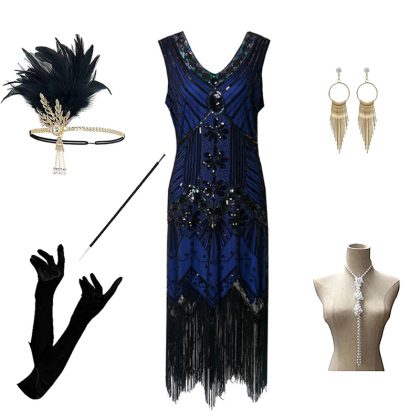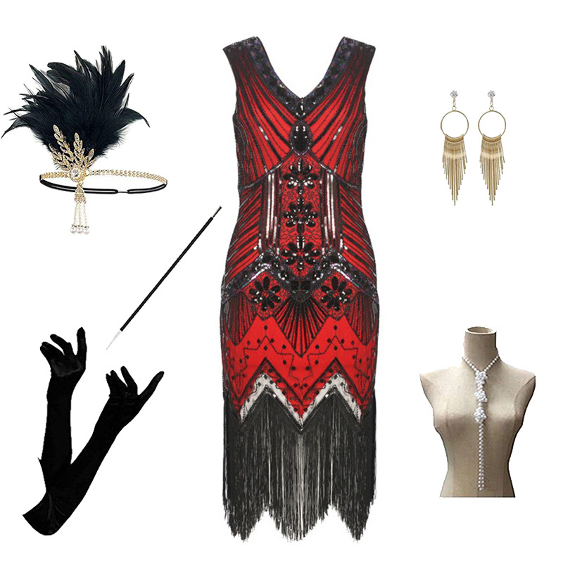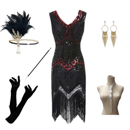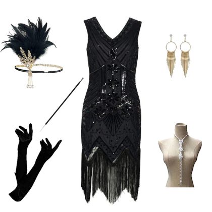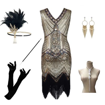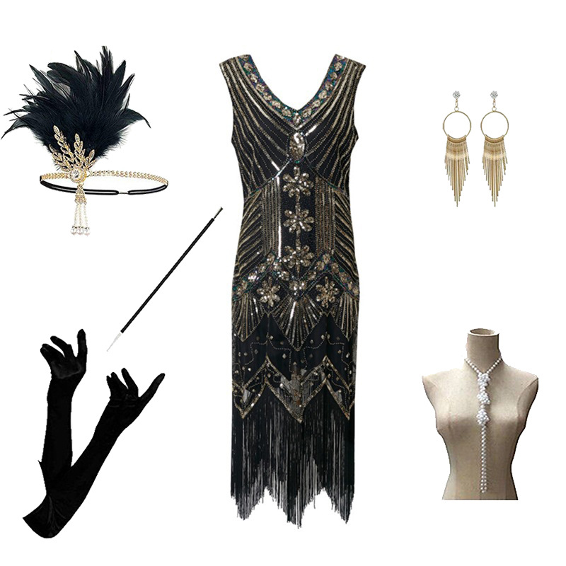 Foreign trade 1920s evening dress women’s black dress heavy industry beaded sequined tassel dress European and American hot sale full set
