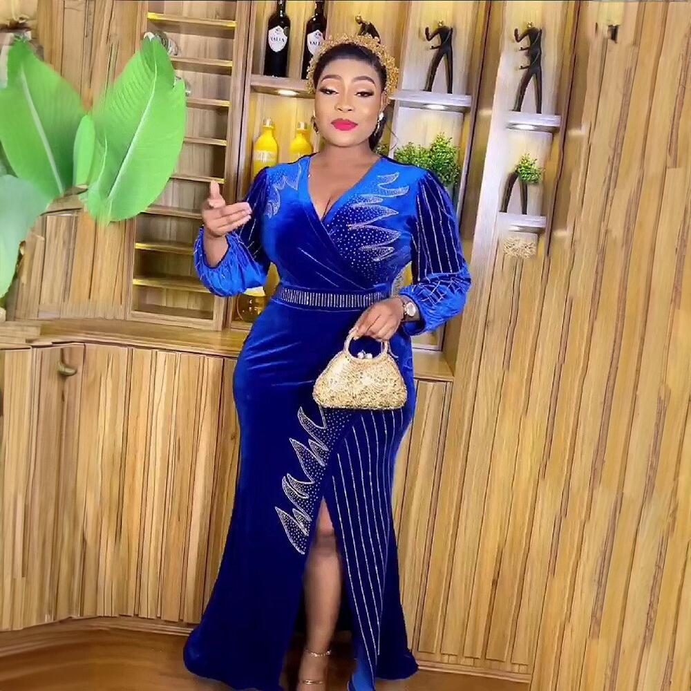Foreign trade African women's fishtail skirt elastic gold velvet rhinestone V-neck long sleeve cross-border source in stock