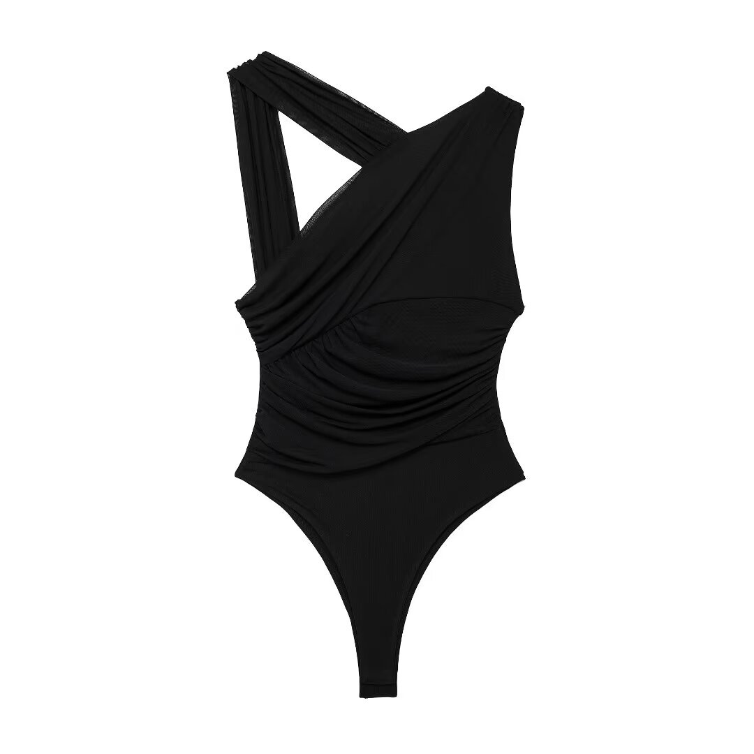 Foreign trade cross-border European and American 2024 spring new women’s slim-fit asymmetric pleated tulle sexy silk mesh jumpsuit