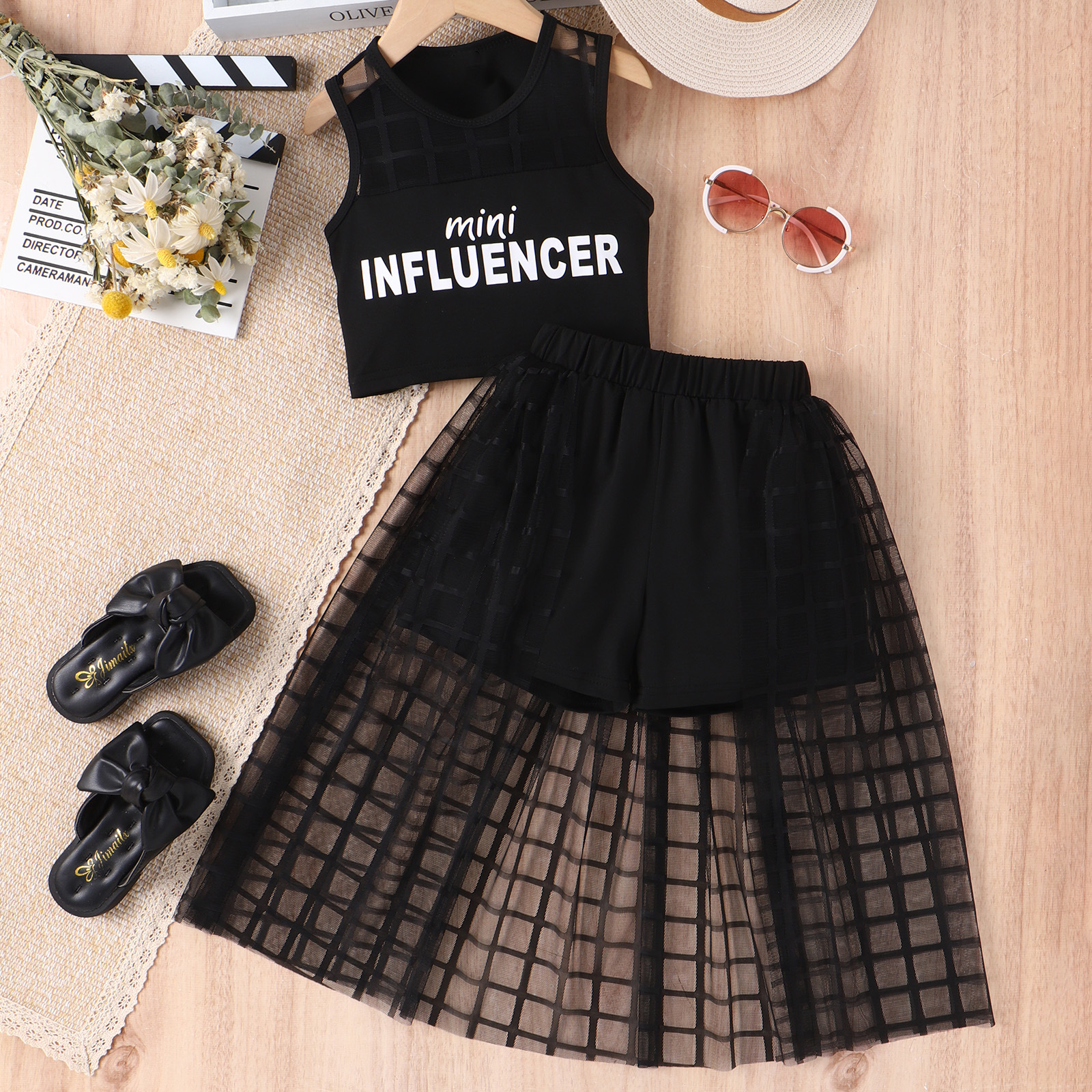 | nameOriginal | Foreign trade cross-border summer small and medium-sized children's letter printed vest shorts spell plaid mesh skirt girls set in stock |