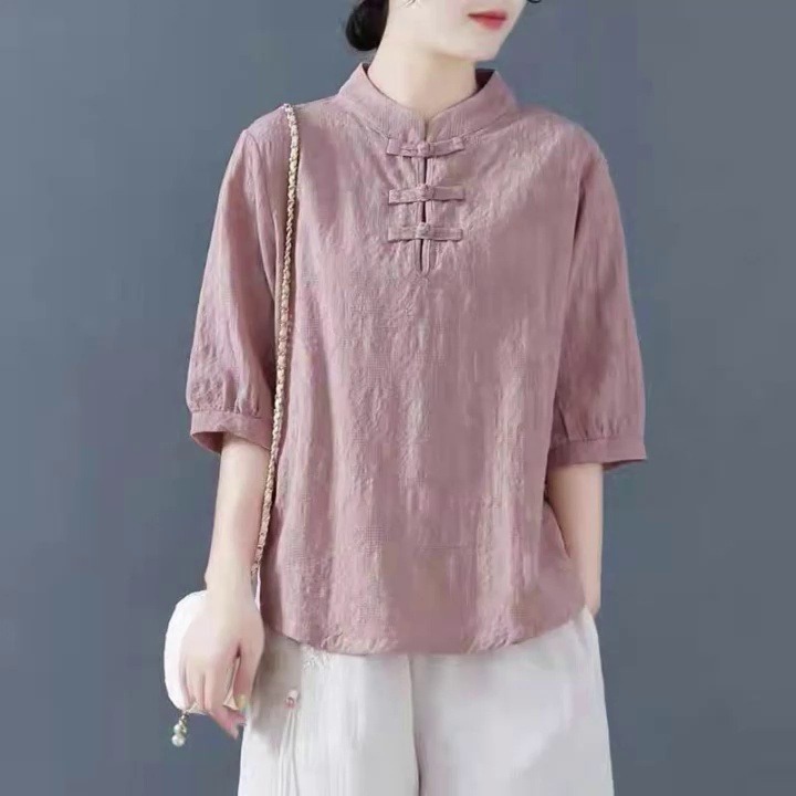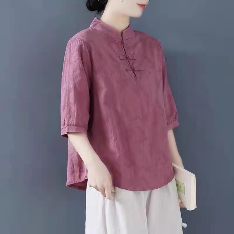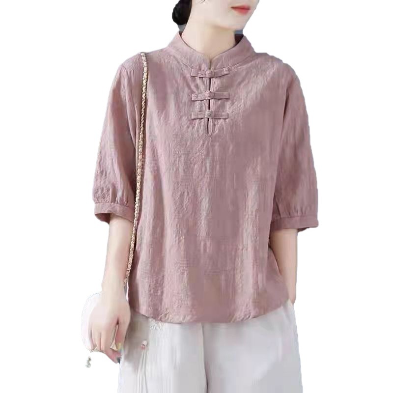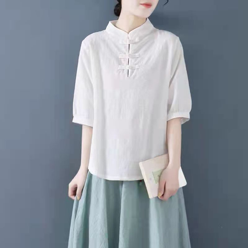 | nameOriginal | Foreign Trade French Single Button Cotton Linen Middle Sleeve Shirt Chinese Style Collar Zen Tea Clothing Summer plus size Linen T-shirt Women's Clothing |
