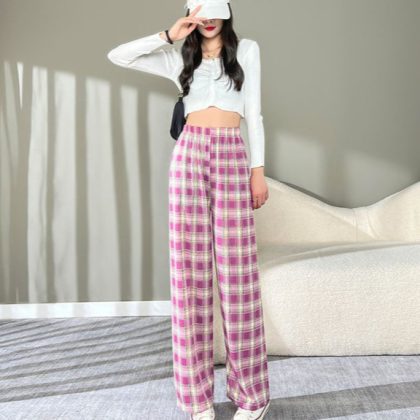 | nameOriginal | Foreign Trade Ice Silk Plaid Pants Women's Summer Vertical Straight Pants Pink Loose Pajama Pants Thin High Waist Plaid Wide Leg Pants |