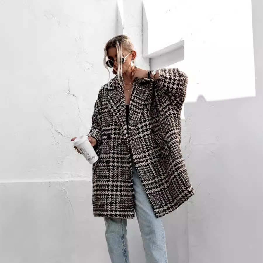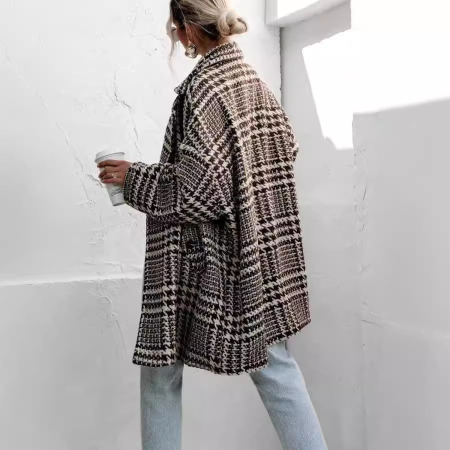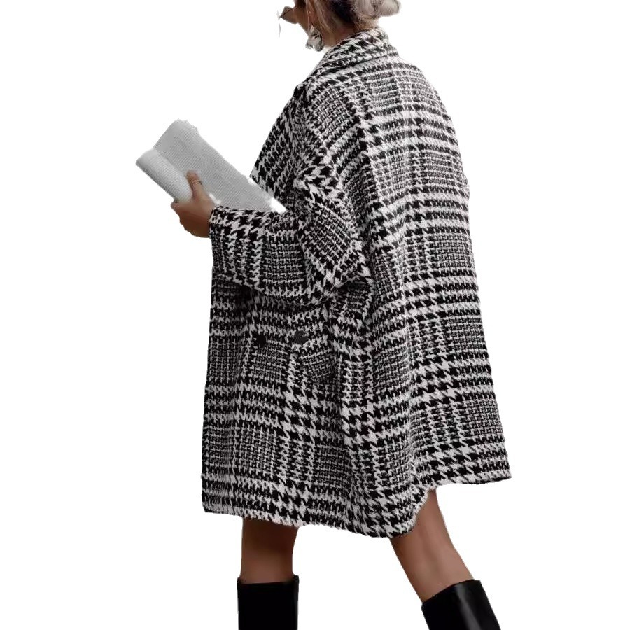 Foreign Trade Women’s Clothing Amazon AliExpress Autumn and Winter Cross-border New Thickened Loose Plaid Woolen Houndstooth Women’s Coat