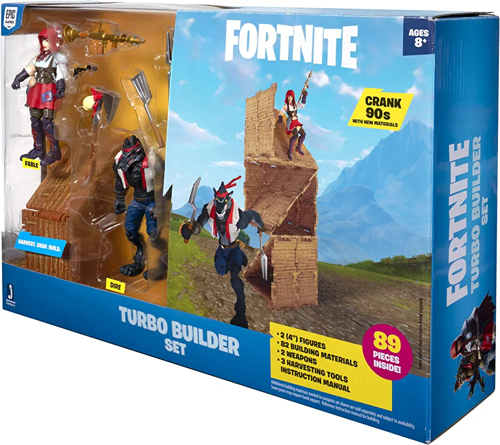 | nameOriginal | Fortnite Turbo Builder Set, 2 Figure Pack – 4 Inch Fable and Dire Collectible Action Figures – Plus 82 Building Materials, 2 Weapons, 3 Harvesting Tools – Collect Them All |