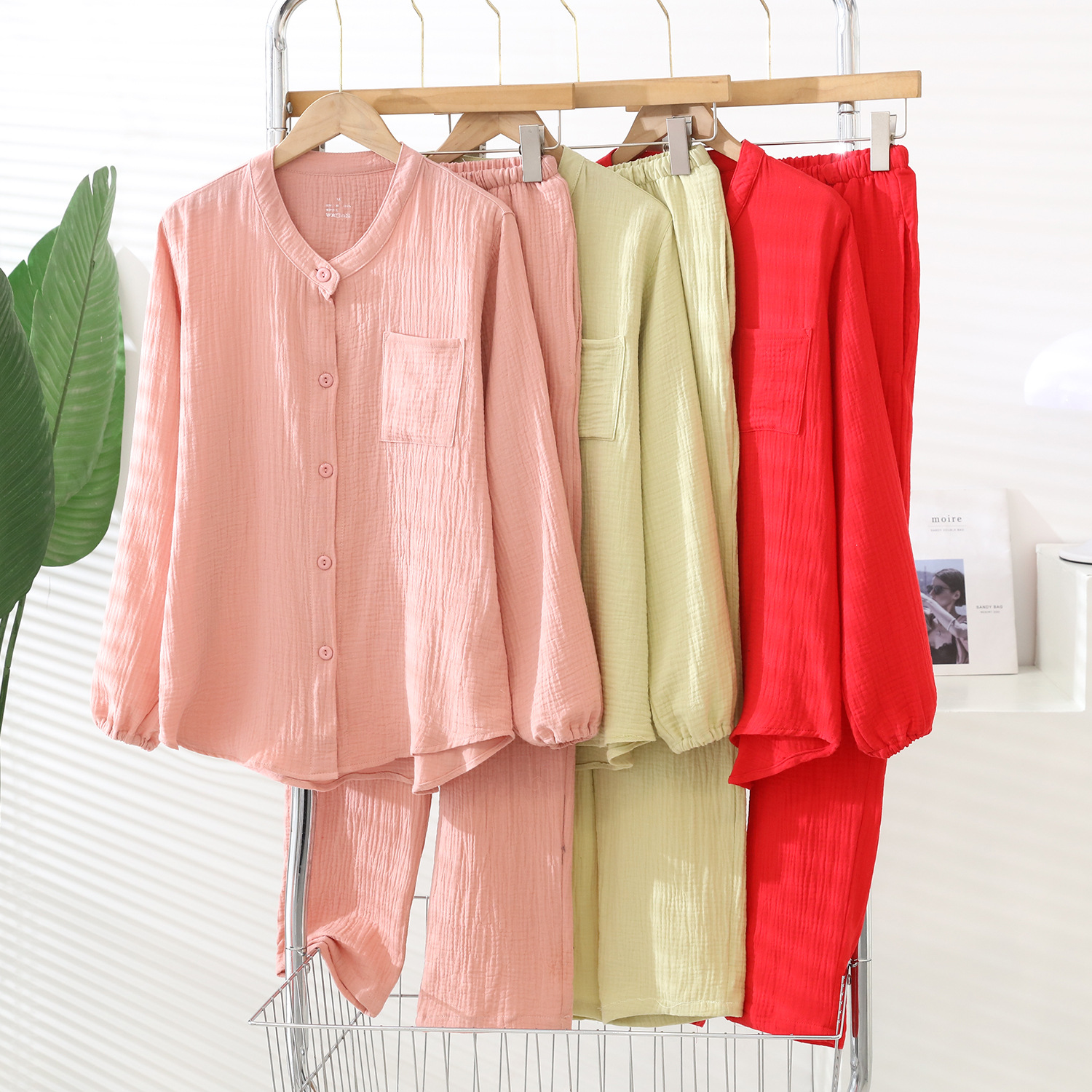 | nameOriginal | Four Seasons New Style Crepe Men's and Women's Pajamas Double-Layer Cotton Yarn Couple's Home Clothes Cotton Simple Long Sleeve Trousers |