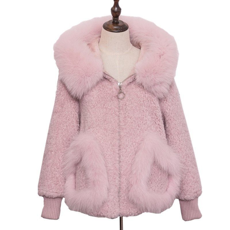 Free shipping 2023 autumn and winter faux fox fur collar sheepskin fur coat women's autumn and winter Korean style hooded short wool