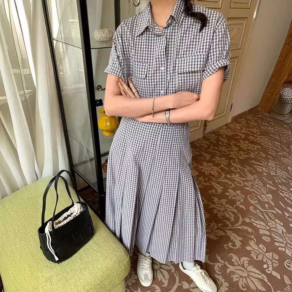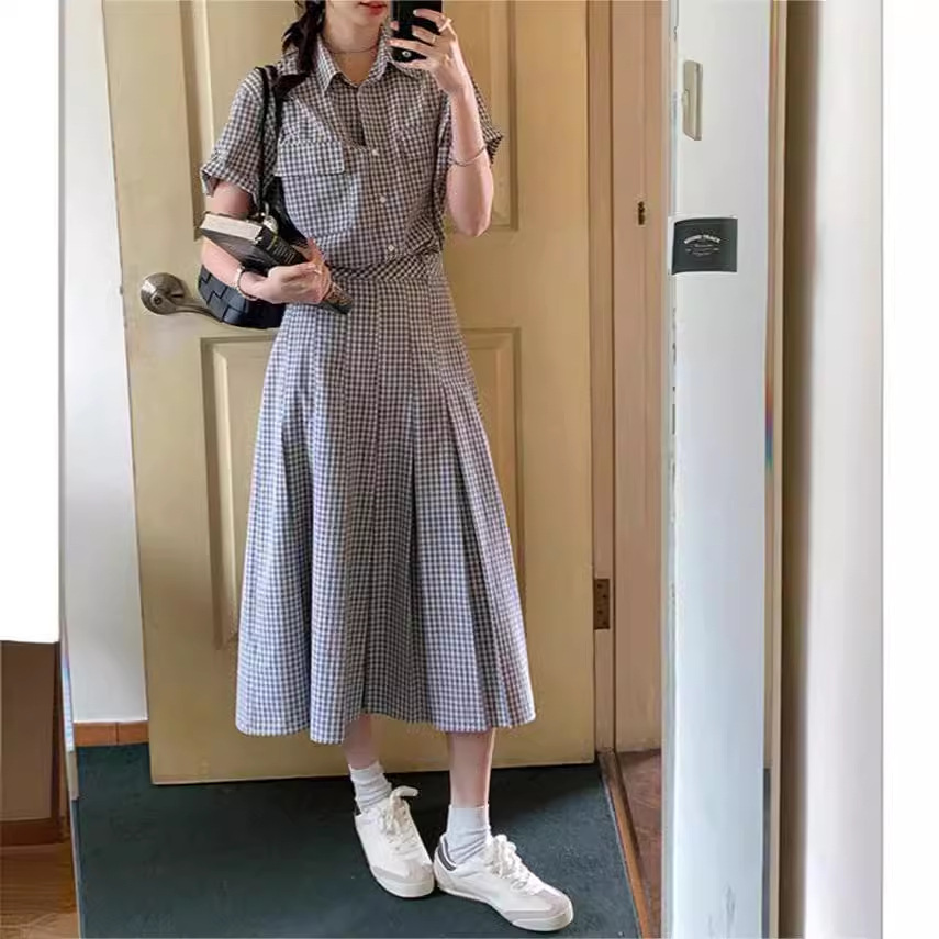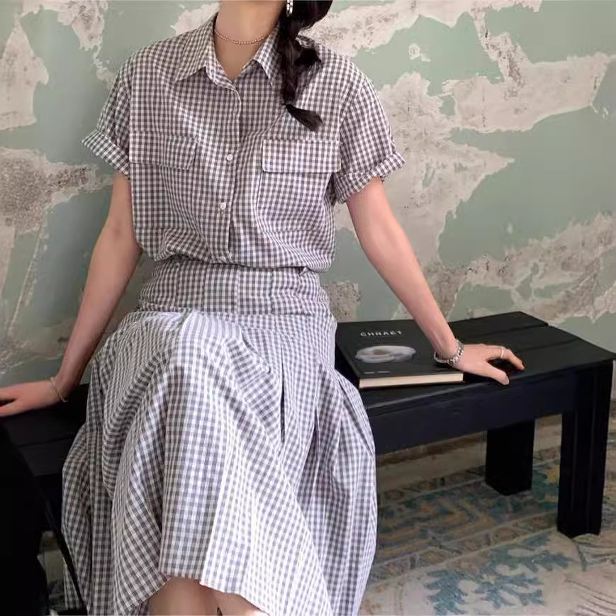 | nameOriginal | French Academy Sweet suit Black and White Plaid Short-sleeved Shirt Women's High Waist Slimming Commuter Pleated Skirt Summer |