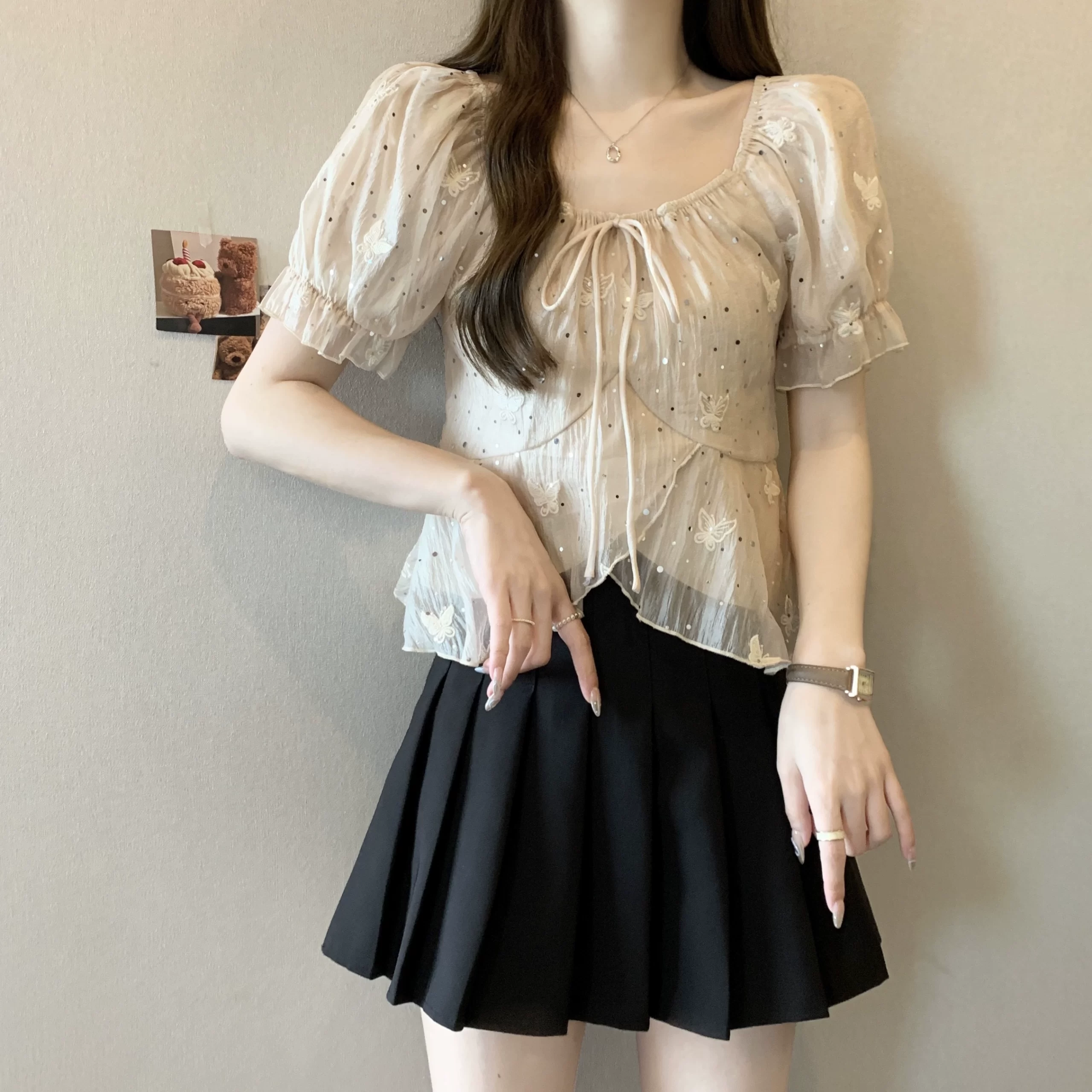 | nameOriginal | French belly-covering irregular mesh sequin short-sleeved shirt |