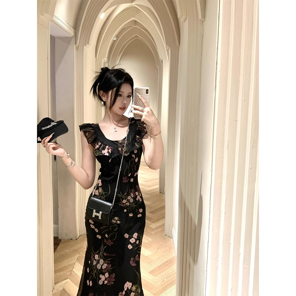 | nameOriginal | French black summer style hip-hugging floral dress |