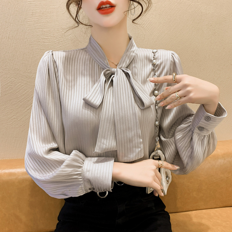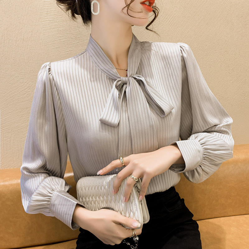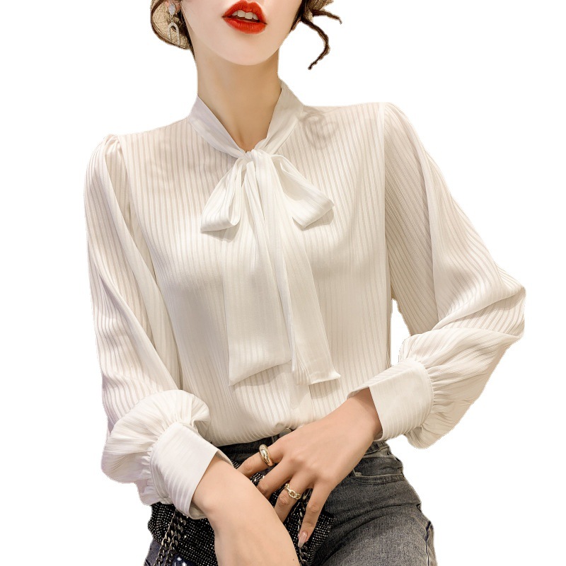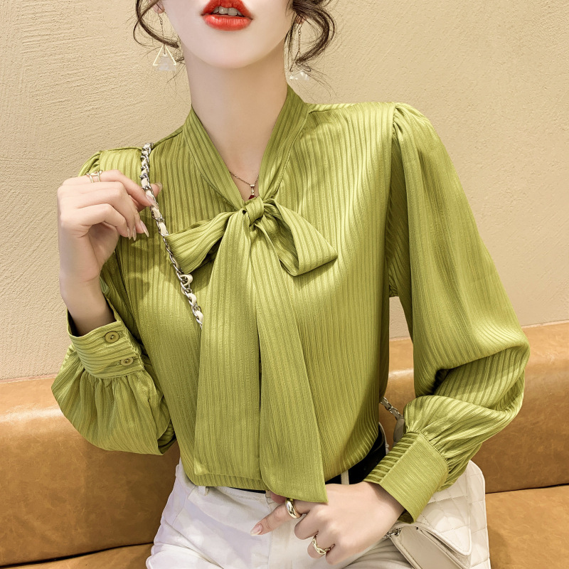 French Chiffon Shirt Women's 2023 New Spring Stylish Fashion Lace-up Green Shirt Bow Puff Sleeve Top