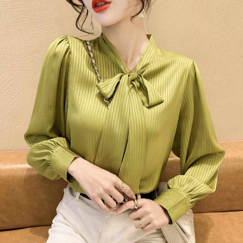French Chiffon Shirt Women’s 2023 New Spring Stylish Fashion Lace-up Green Shirt Bow Puff Sleeve Top