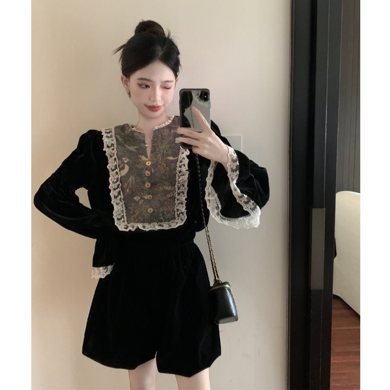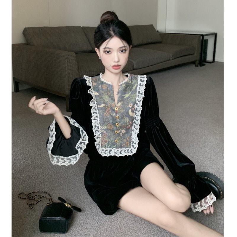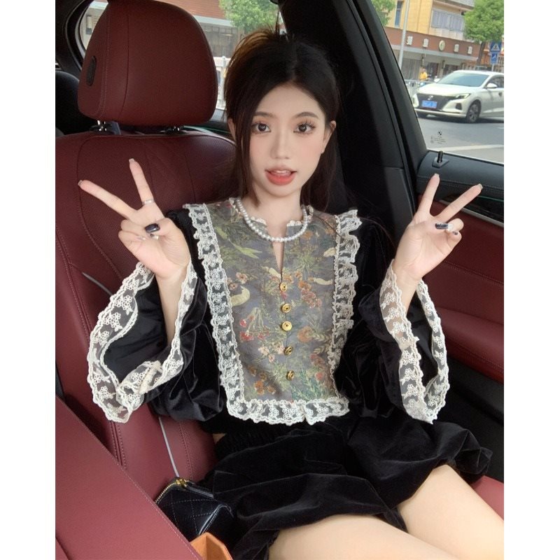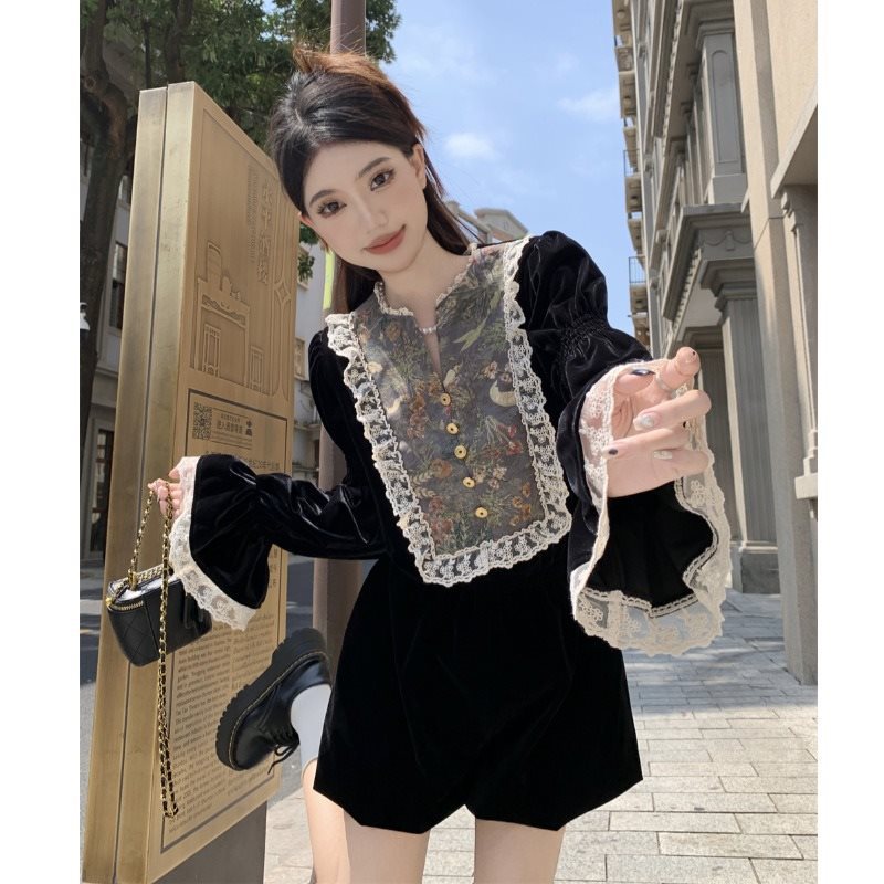 | nameOriginal | French Court Style Lace Stitching Horn Sleeve Velvet Long Sleeve Shirt Women's Rich Family Daughter Elegant Fairy Top |