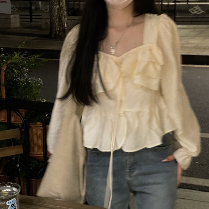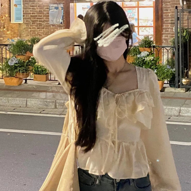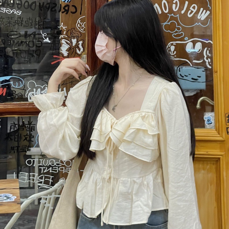 French design sense niche square collar shirt Women’s 2024 spring cropped ruffled slimming top shirt