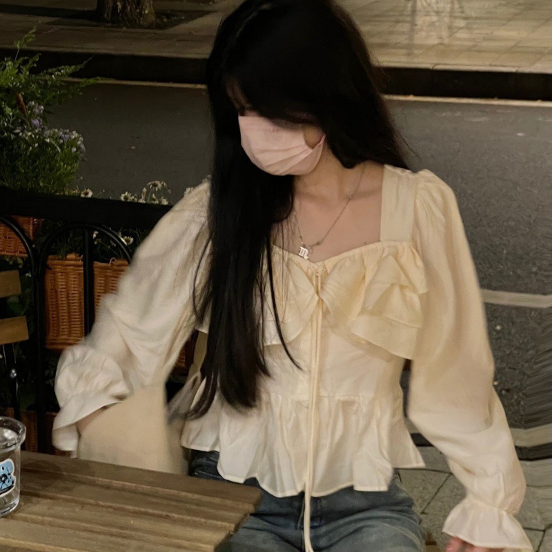 French design sense niche square collar shirt Women's 2024 spring cropped ruffled slimming top shirt
