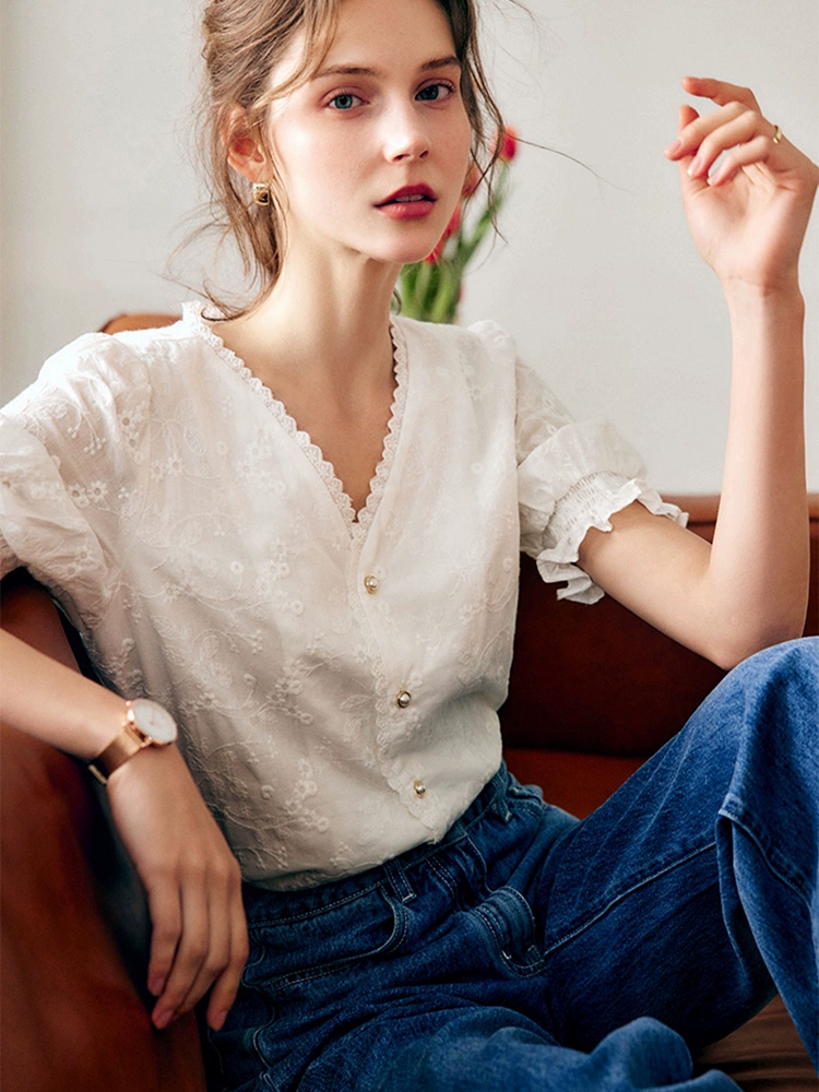 | nameOriginal | French gentle V-neck white shirt women's summer design niche elegant temperament puff sleeve embroidered short-sleeved top |