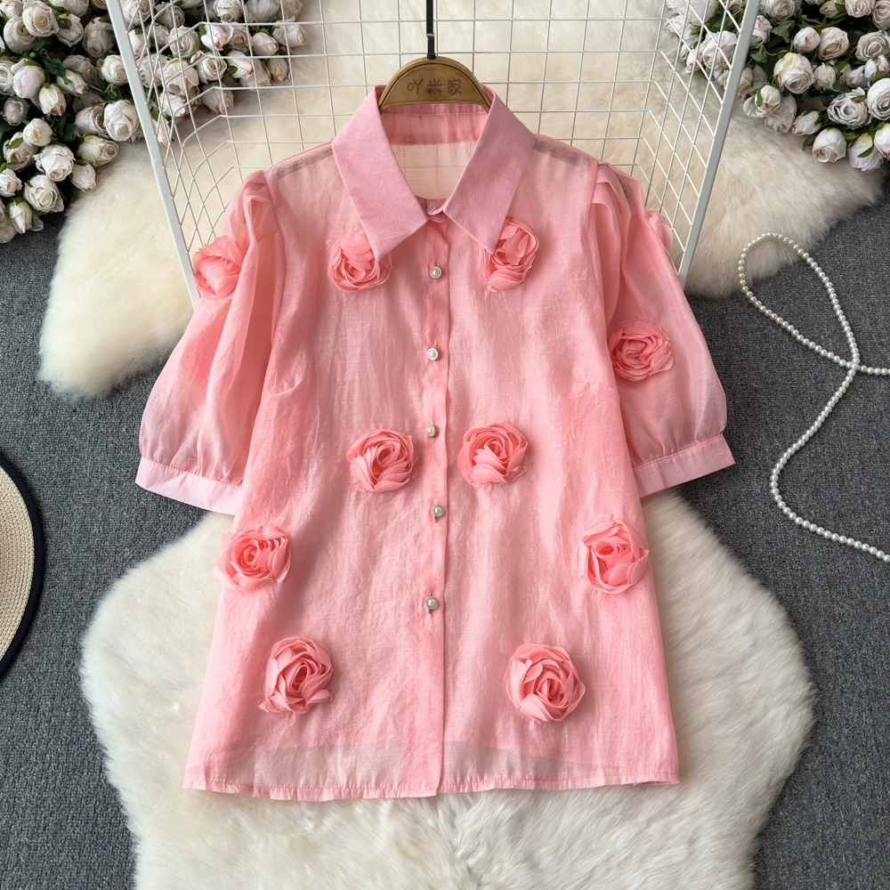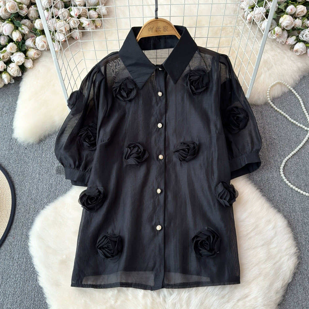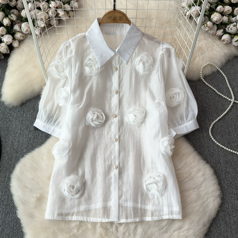 | nameOriginal | French heavy industry three-dimensional flower splicing puff sleeve Tencel short-sleeved shirt fashionable loose slightly permeable temperament top trendy |