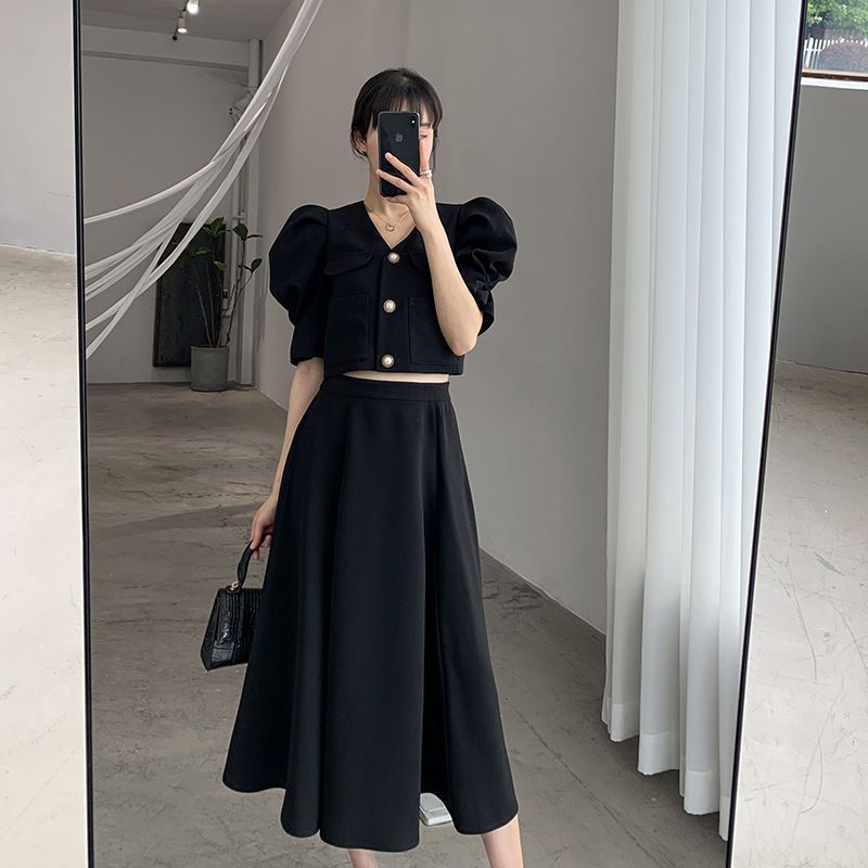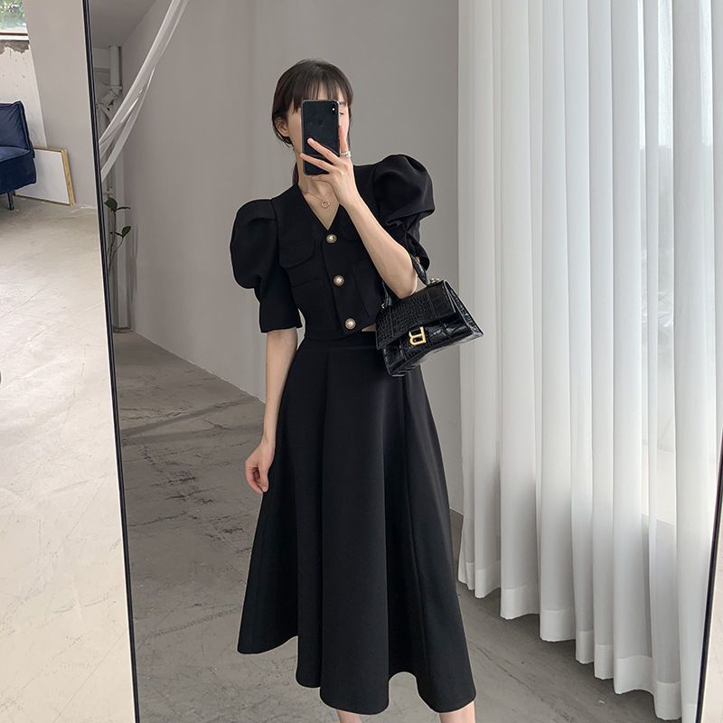 | nameOriginal | French Hepburn Style Two-piece Set Women's dress Summer Black V-neck Elegant Top Half-length Dress for suit |