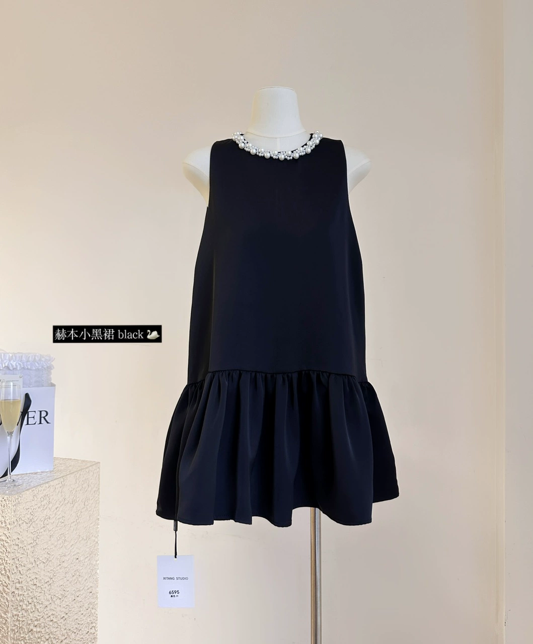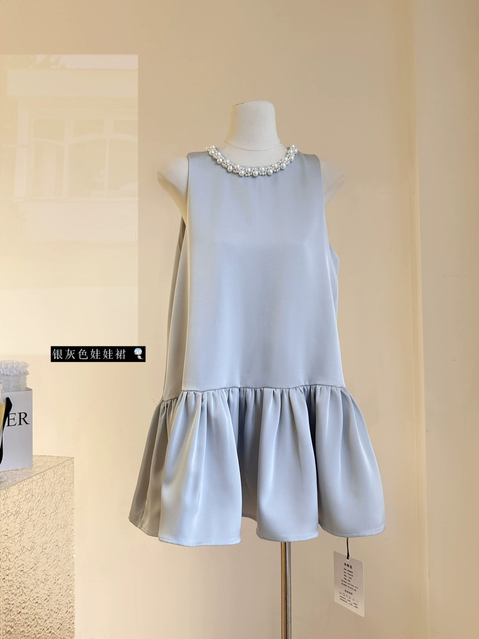 French high-end exquisite pearl round neck sleeveless vest dress summer women's silver gray ruffle short skirt