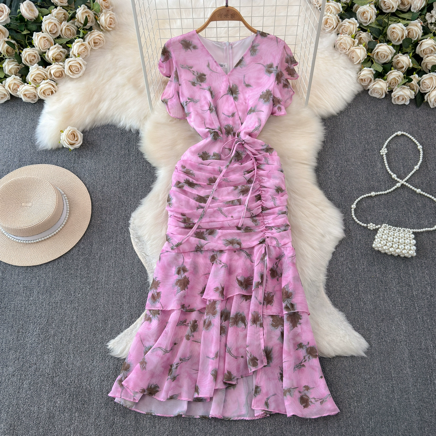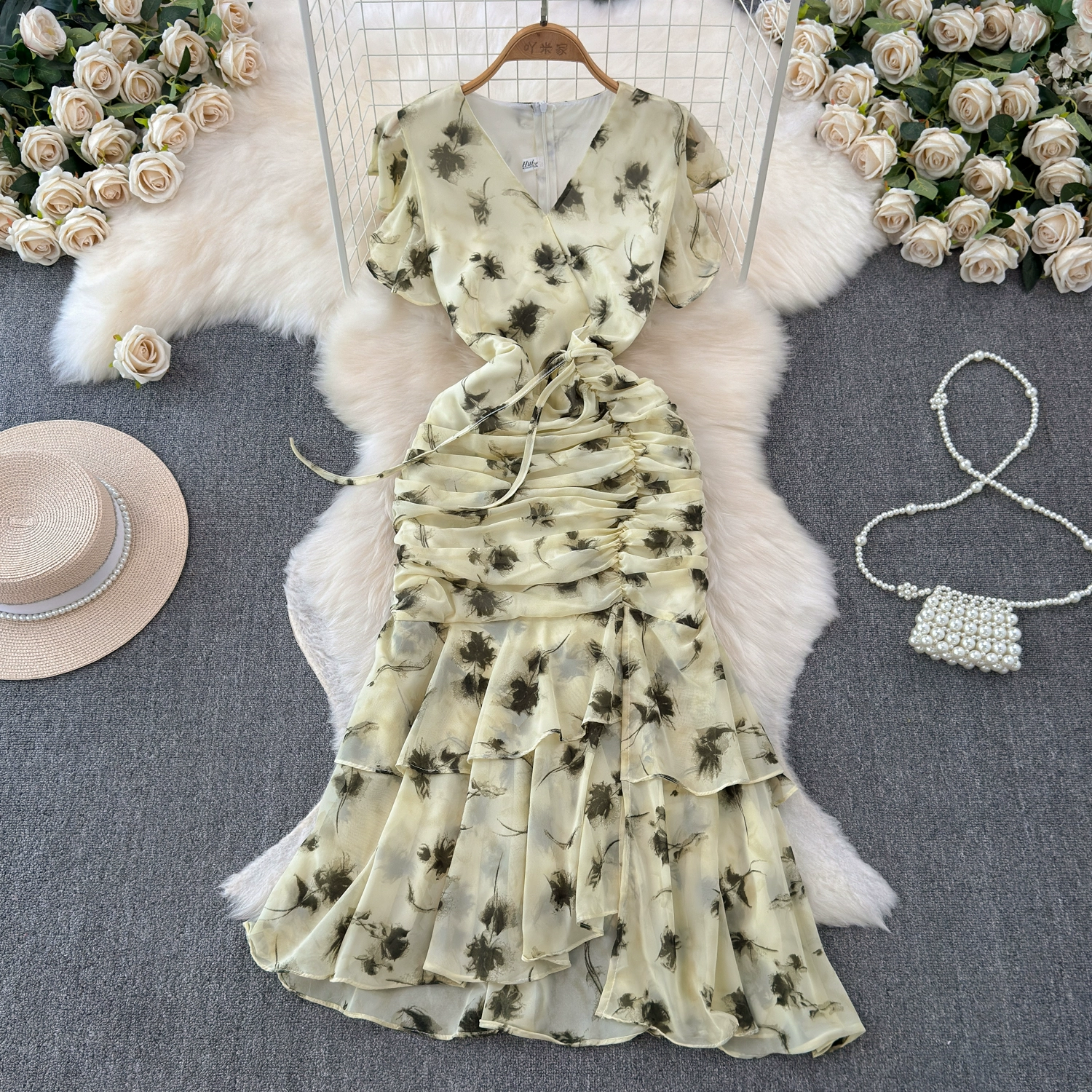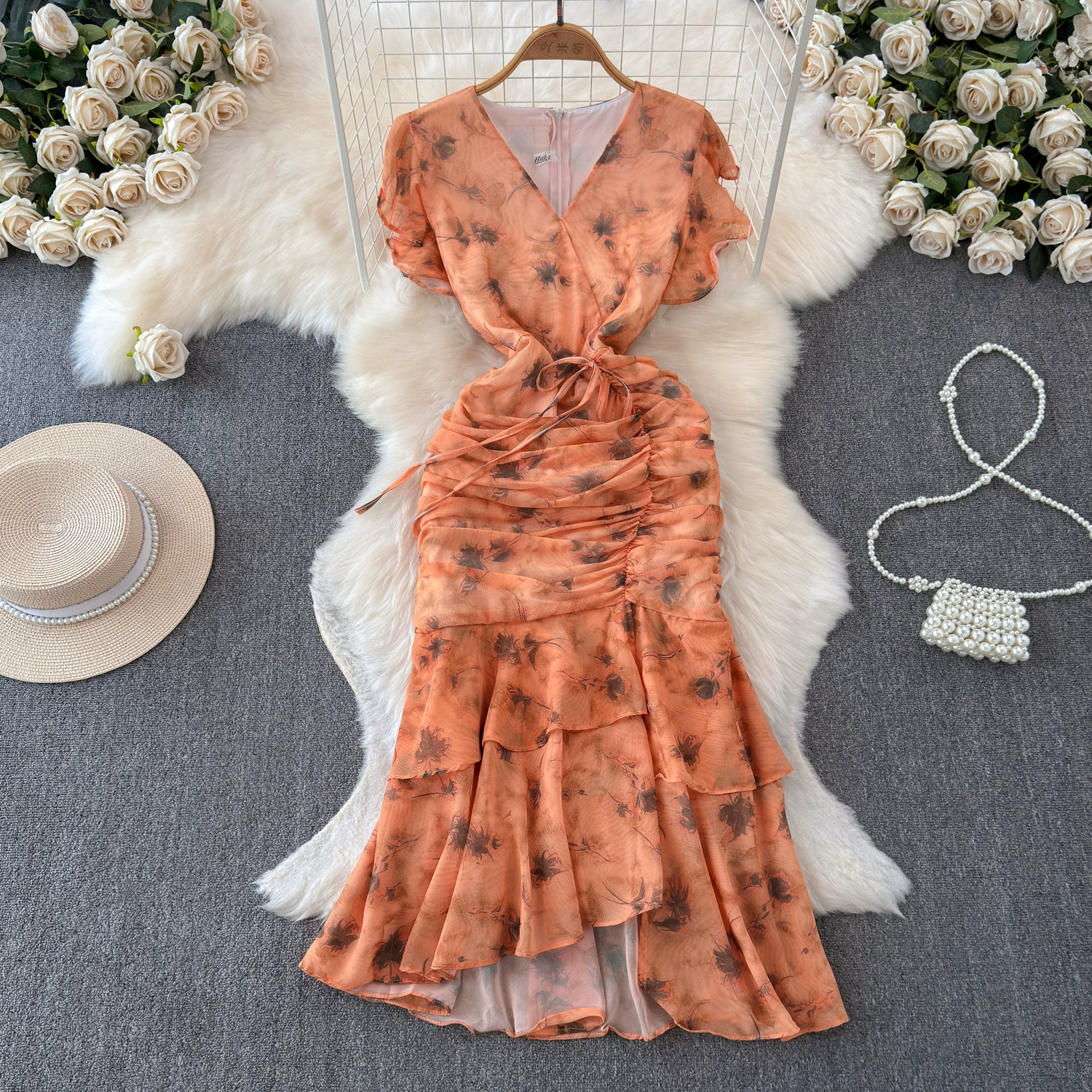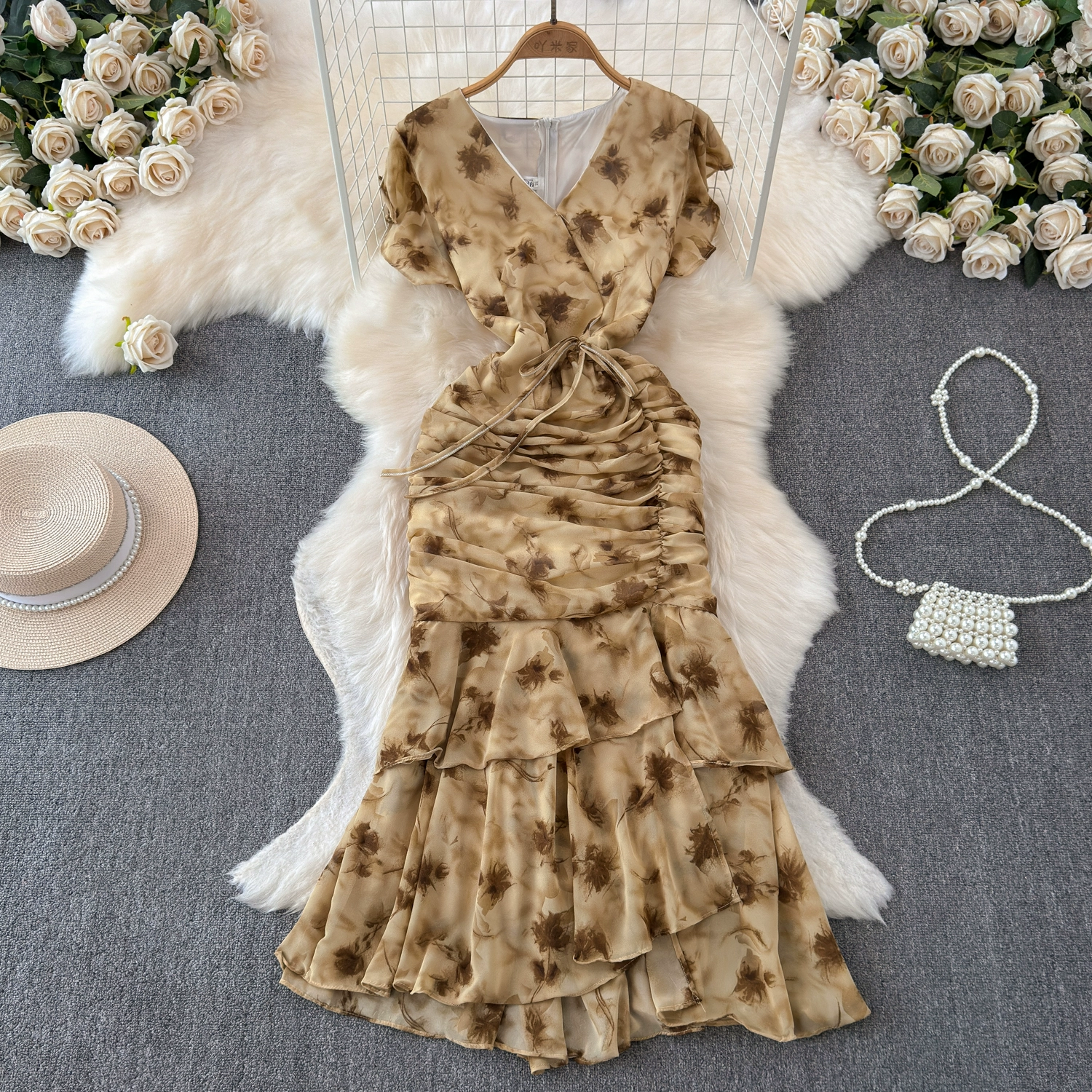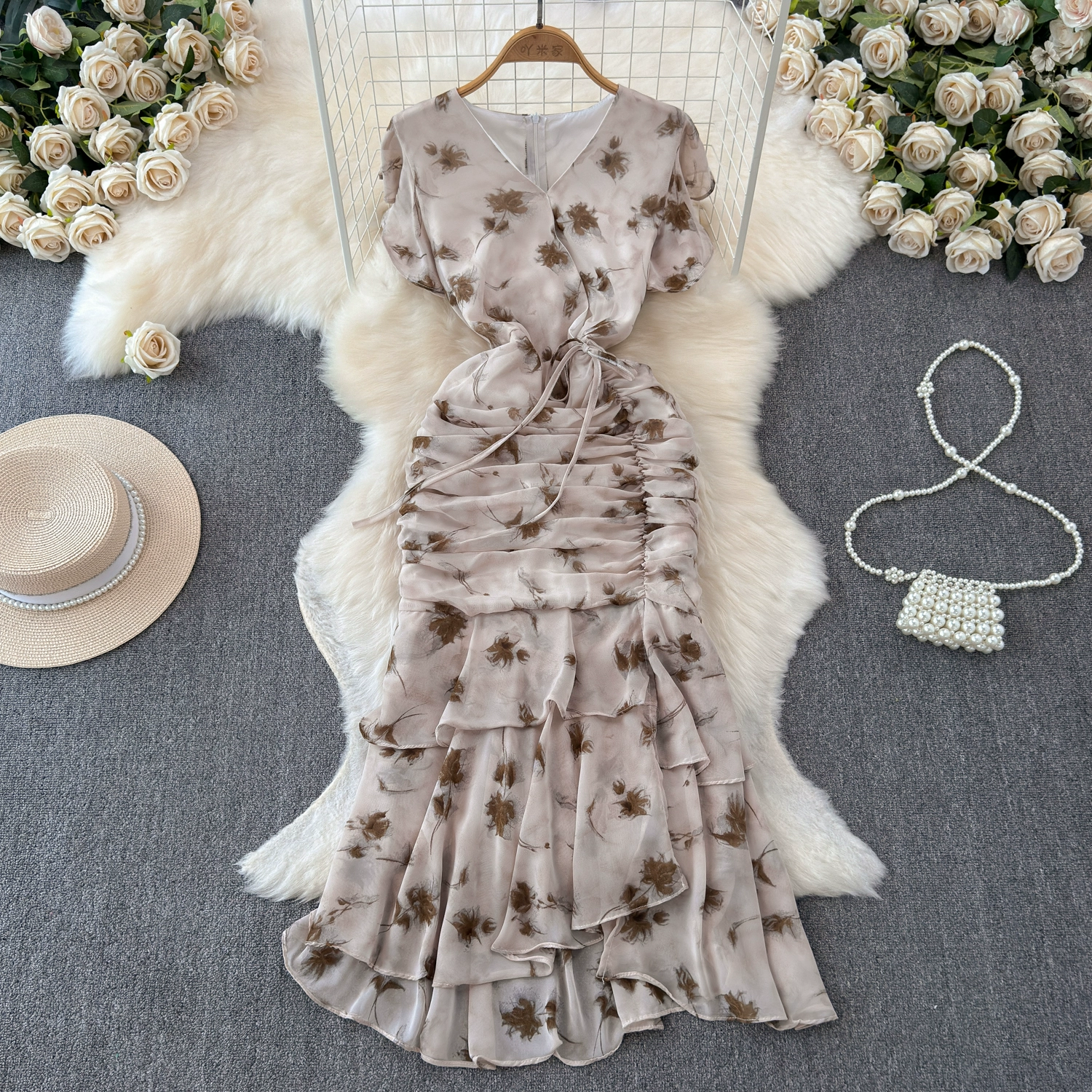 French high-end temperament V-neck waisted floral dress for women with scheming pleats and slim-fitting ruffled fishtail long skirt