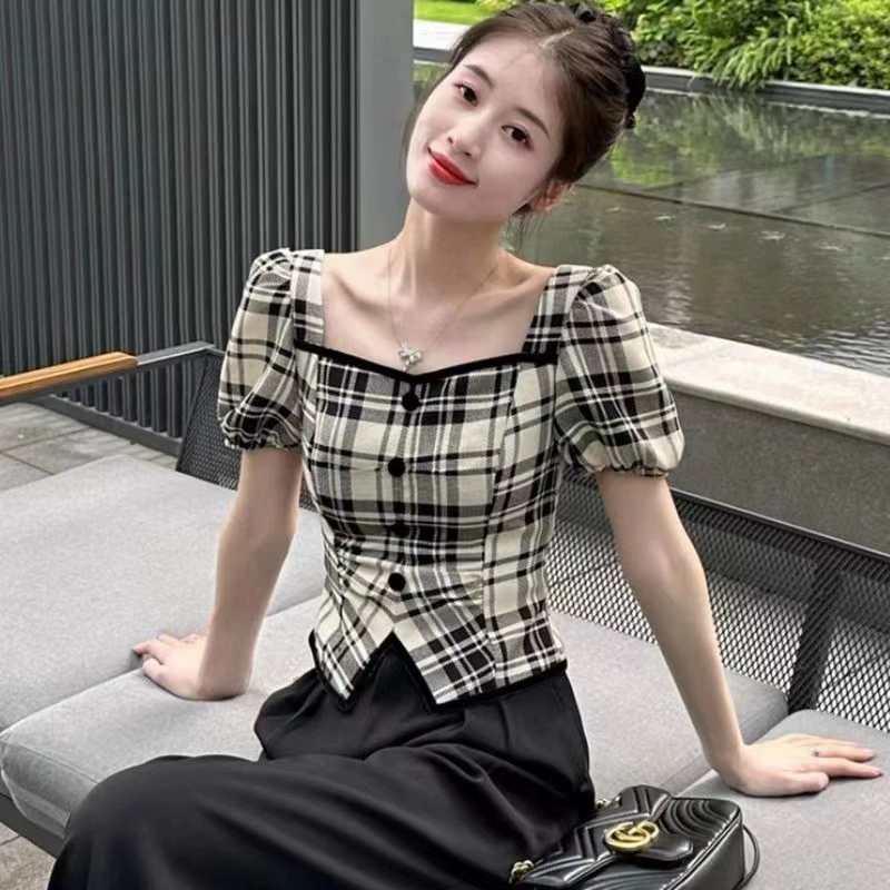 | nameOriginal | French large plaid high-end niche square collar short-sleeved shirt |