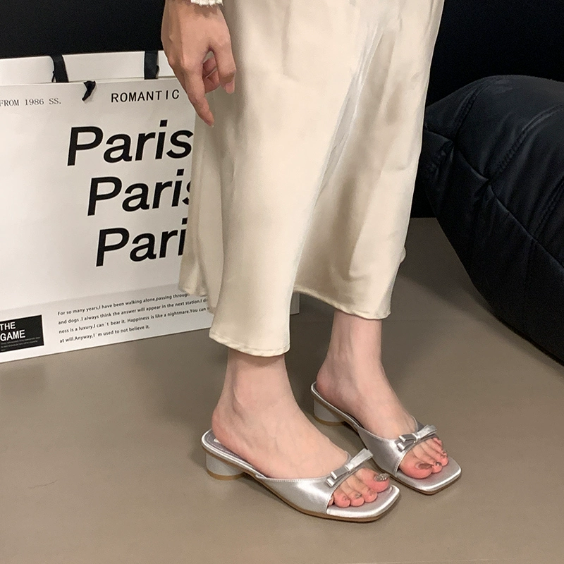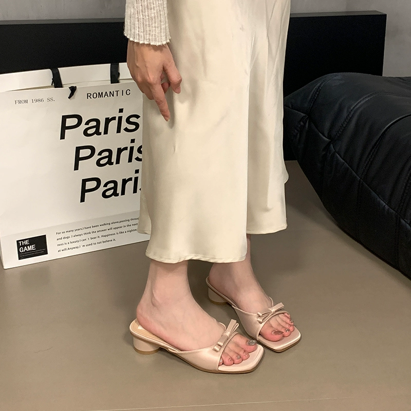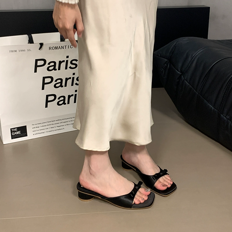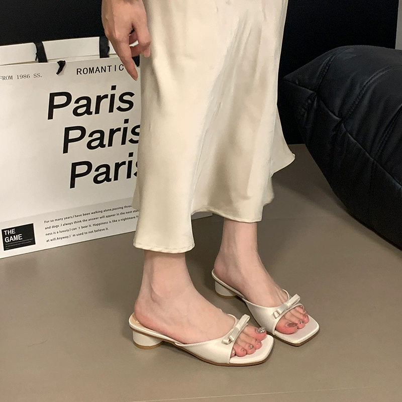 French one-piece belt with skirt, thick heels, sandals and bow tie