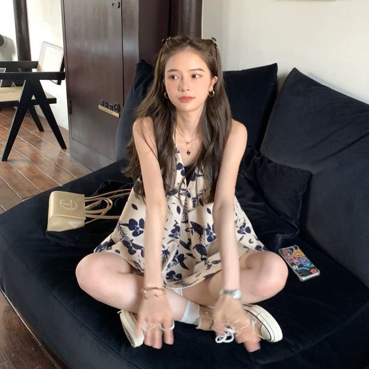French print vest sleeveless babydoll top with suspenders