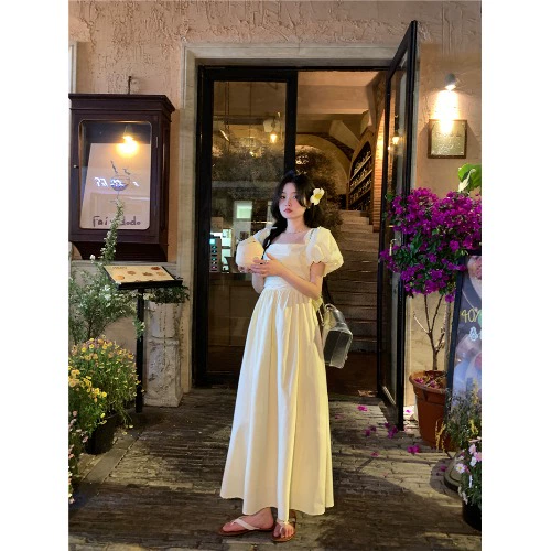 French Puff Sleeve Summer Backless A-Line Skirt with Bow